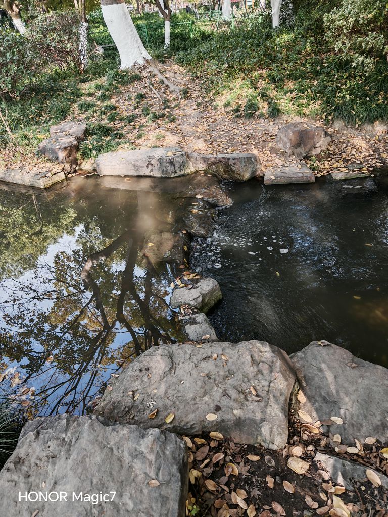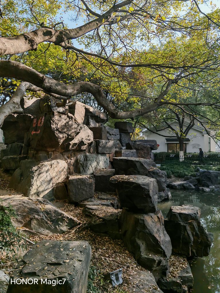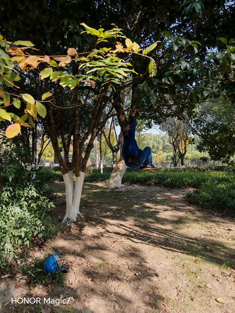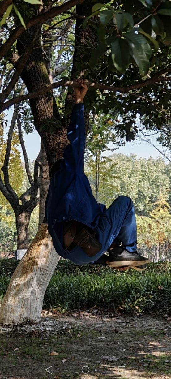 正走着,忽见一支歪脖子树枝上吊着个人。那人一只手弯曲着紧扣树枝,身子像刺猬似的蜷成一团,头埋在胸前,离地足有两米多。我赶紧掏出手机拍了张照,还没站稳,他已像猴子般“噌”地跳落地面,转过身来与我打了个照面。我忙竖起大拇指,他笑得满脸舒展,精神头足得很,下巴上留着六七寸长的胡须,黑白相间,倒有几分仙风道骨。“您这身手可真厉害!”我忍不住赞叹。他摆摆手,嗓门洪亮:“年轻时在少林寺练过三年,砖石都能轻松击碎。”他说自己从山东来,今年64岁,平时在附近帮人装修,挑沙泥、扛水泥、搬砖头,昨天刚好歇工,来公园透透气。