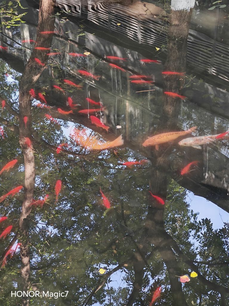 绕着公园转了圈,中心的荷花塘边最是热闹。大小平台上,广场舞的音乐此起彼伏,红的绿的裙摆随着节奏起落,衬着塘里残荷,倒成了秋日里最鲜活的画面。