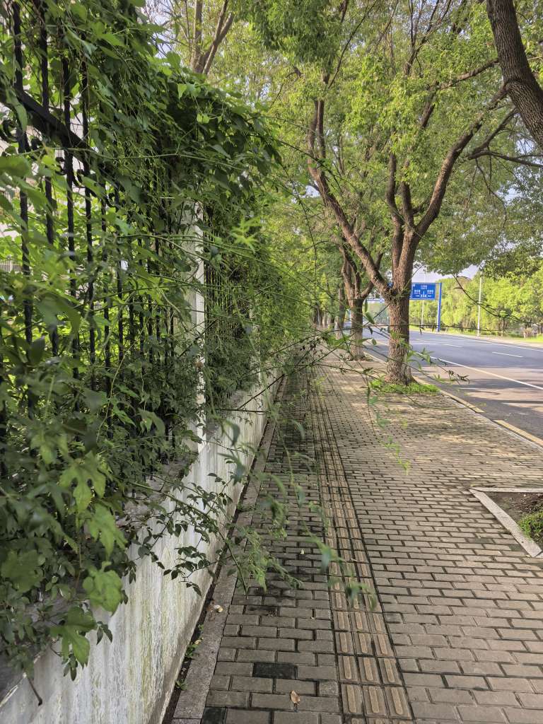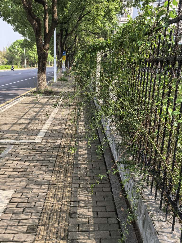 梅山小区物业在该小区的南侧和西侧围墙内侧大规模栽种“藤类绿植”,但长期疏于管理。目前西侧绿植几乎全部穿过栅栏,侵占苏州河路东侧