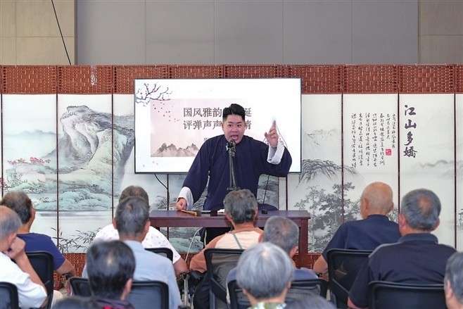 在通安镇华通四区党群服务中心活动室,专业评弹演员连续半月登台,精彩曲目轮番上演,活动室场场爆满。老人们听得津津有味,年轻人也被悠扬的琵琶与婉转的唱腔吸引。这不仅丰富了老年群体的精神文化生活,也让非遗艺术在社区实现了“活态传承”。