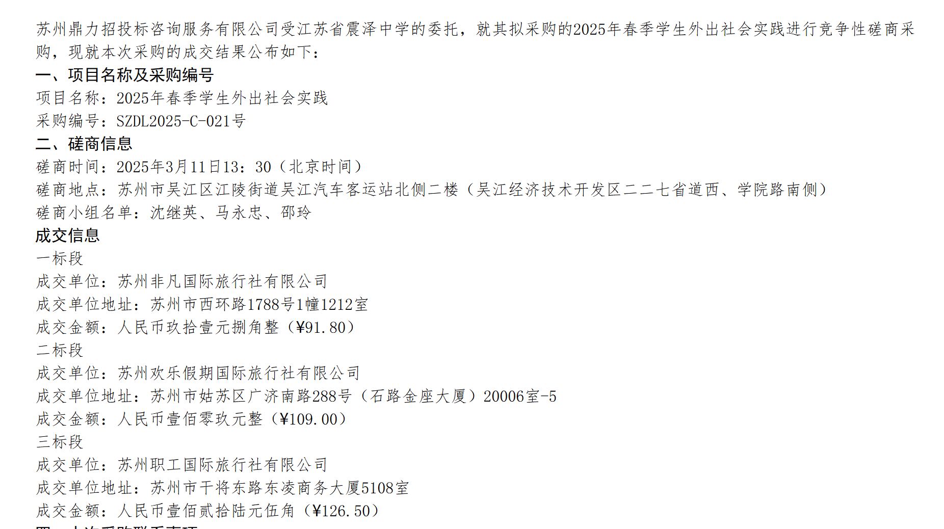 采购编号:SZDL2025-C-021采购内容:2025年春季学生外出社会实践,采购单位:江苏省震泽中学采购类别:服务类时间:2025年3月11日13:30 时(北京时间)三标段,穹隆山,中标单位:苏州职工国旅,中标价格126元/人