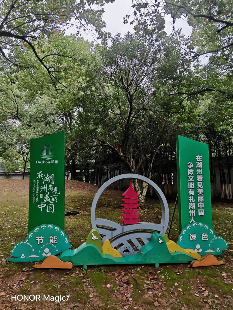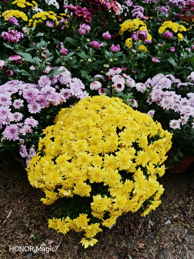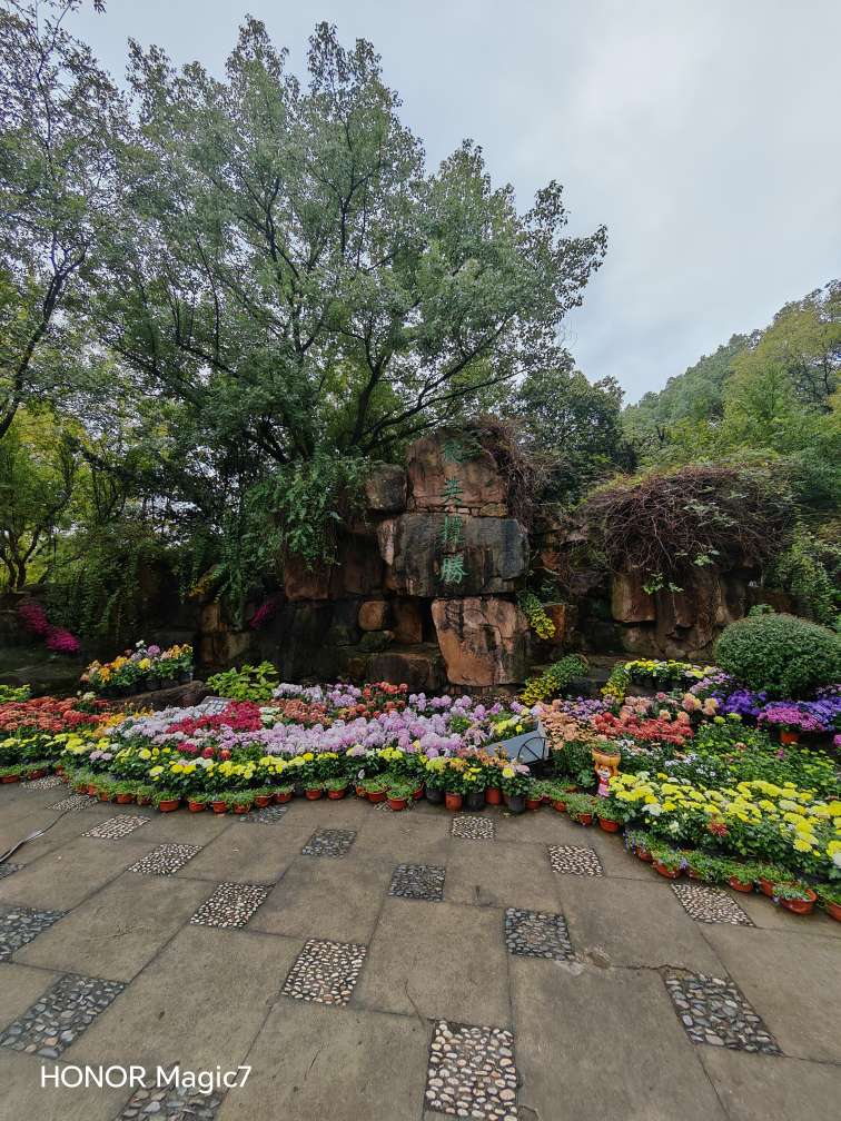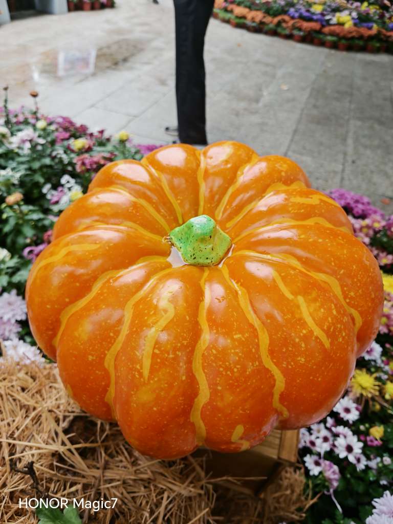 飞英公园正门两旁的菊丛间,点缀着橙黄青绿相间的假南瓜、假玉米,沉甸甸地垂着,衬得秋意格外浓,一派丰收的热闹。游人三三两两举着手机,有的蹲下来拍花芯里蜷着的蜜蜂,有的拉着孩子站在花丛前,把自己和这花团锦簇的景致一并框进屏幕,笑声惊飞了枝头的野鸽子