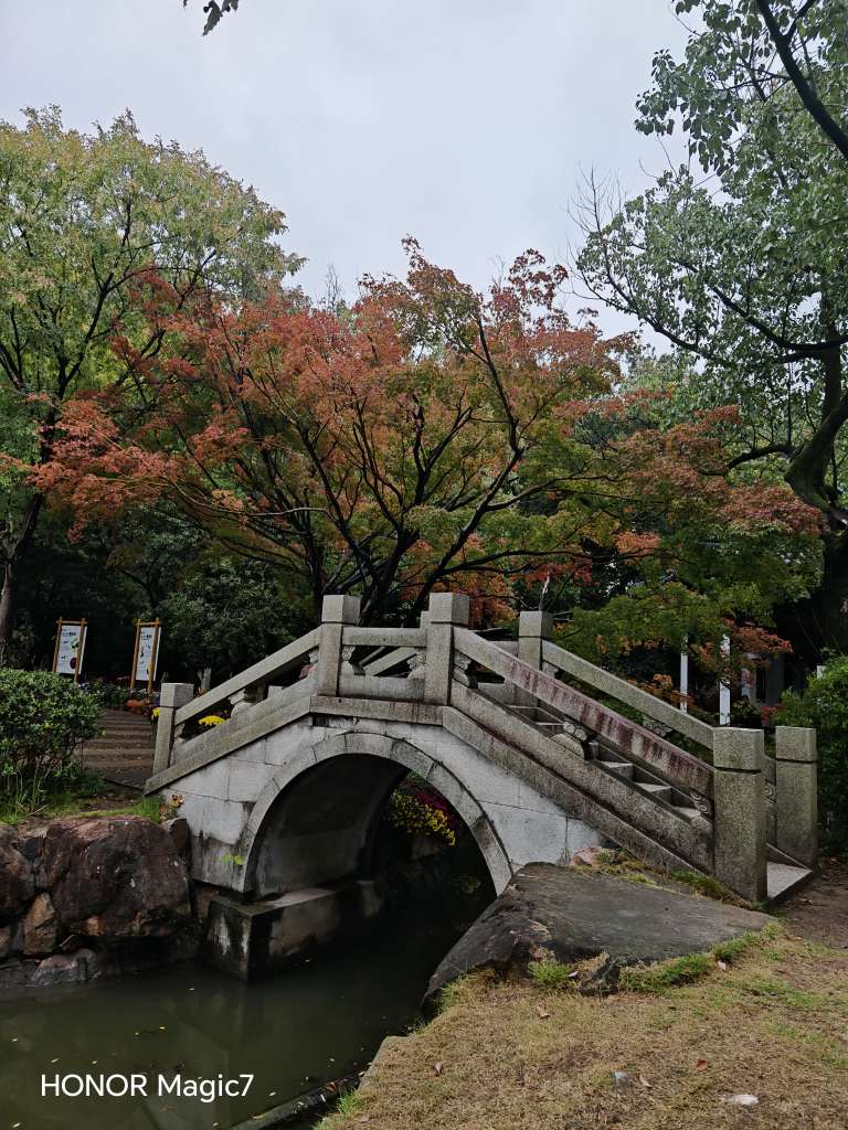 小拱桥边的枫叶红得正透,像燃着团火;对岸银杏的边缘已染上浅黄,叶片在风里打着旋,轻飘飘落在石板路上。亭子里的老人们围坐着,茶杯的碰撞混着“嚼白淡”声飘过来,和这秋光的节奏正相配。只是今年的菊展确比去年疏些,约莫少了三分之一,不少造型里掺了****花。