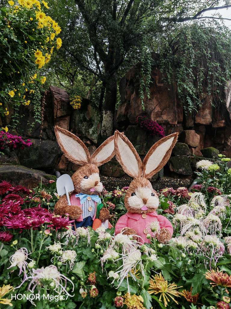 花丛里藏着两只绒毛灰扑扑的假兔子,一只探着脑袋瞅花,耳朵支着像两片小叶子;另一只缩着身子埋进叶瓣中,只露半截尾巴,倒真像在******。