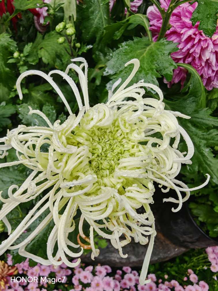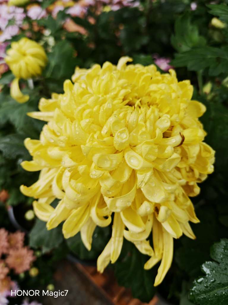 池边摆着的各式菊花被昨夜的雨水洗得发亮:红的像簇着的小火苗,风一吹就晃悠悠地跳;黄的似揉碎的阳光,金闪闪的晃人眼;紫的如浸了淡墨的云霞,蒙着层朦胧的艳。花瓣上的水珠轻轻一晃,便顺着挺直的花杆滚下来。