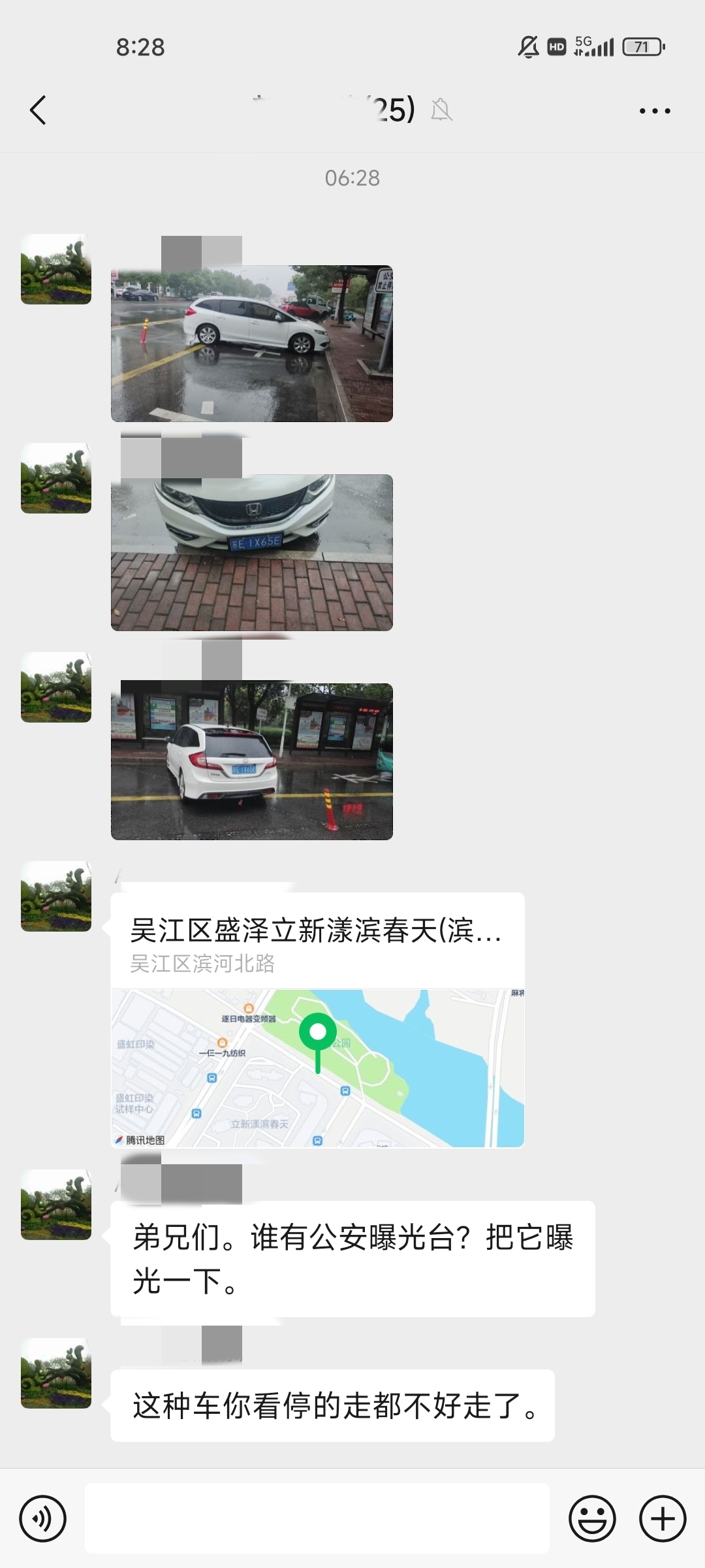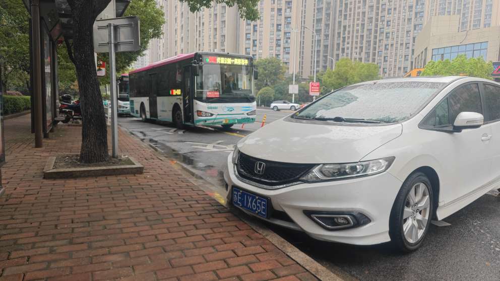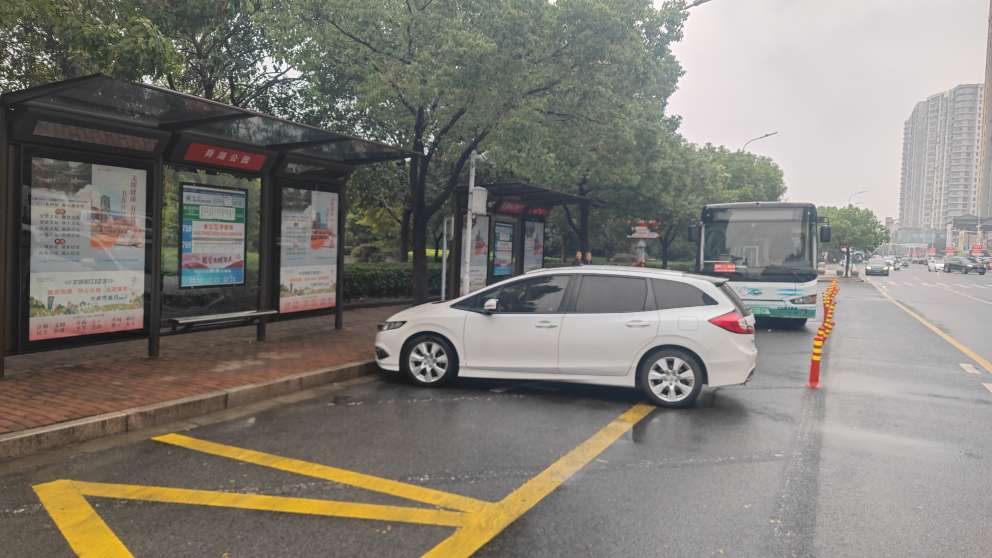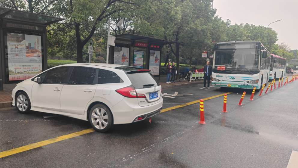 在盛泽镇舜湖公园公交首末站,这台车刚好堵在了公交站台通道的出口,公交站台区域安装了隔离警示桩都挡不住他的违停。早上6:00公交车第一班就发车了,到了8点多这台车还没有走。