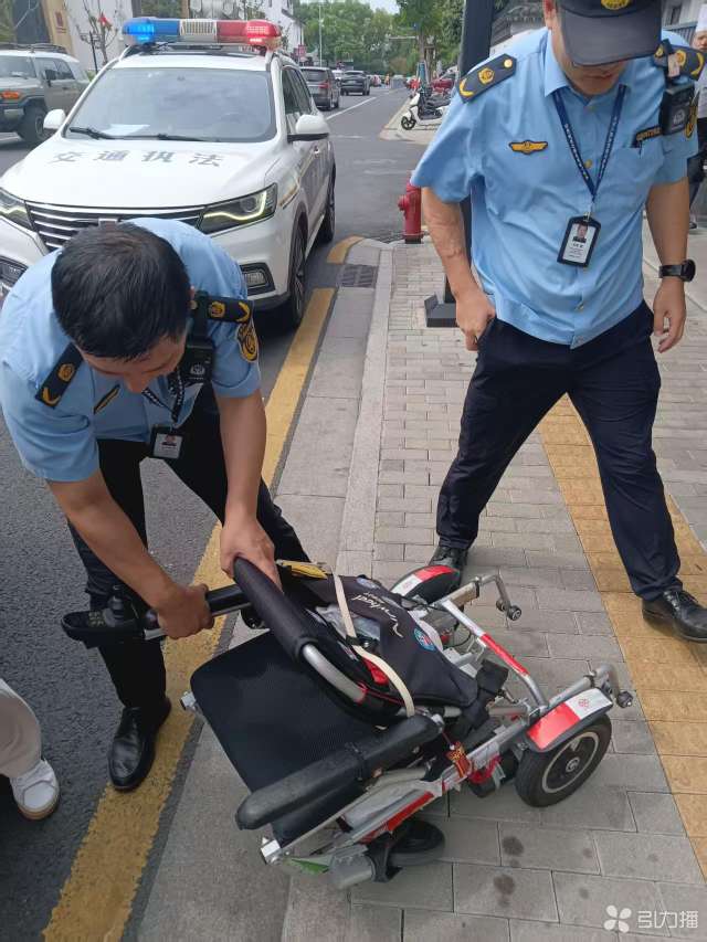 原来,这位女士与同伴一行三人来苏州旅游,同行的女儿行动不便,需乘坐轮椅出行。她们因一时打不到网约车,便打算步行前往一公里外拙政园附近的酒店,却被广场上的层层台阶挡住了去路,无奈之下只得寻求帮助。 尽管酒店直线距离不远,但考虑到轮椅长途行走的困难,加上当天超过30℃的高温,匡兴刚与同事没有犹豫,迅速决定调配执勤车辆护送她们。