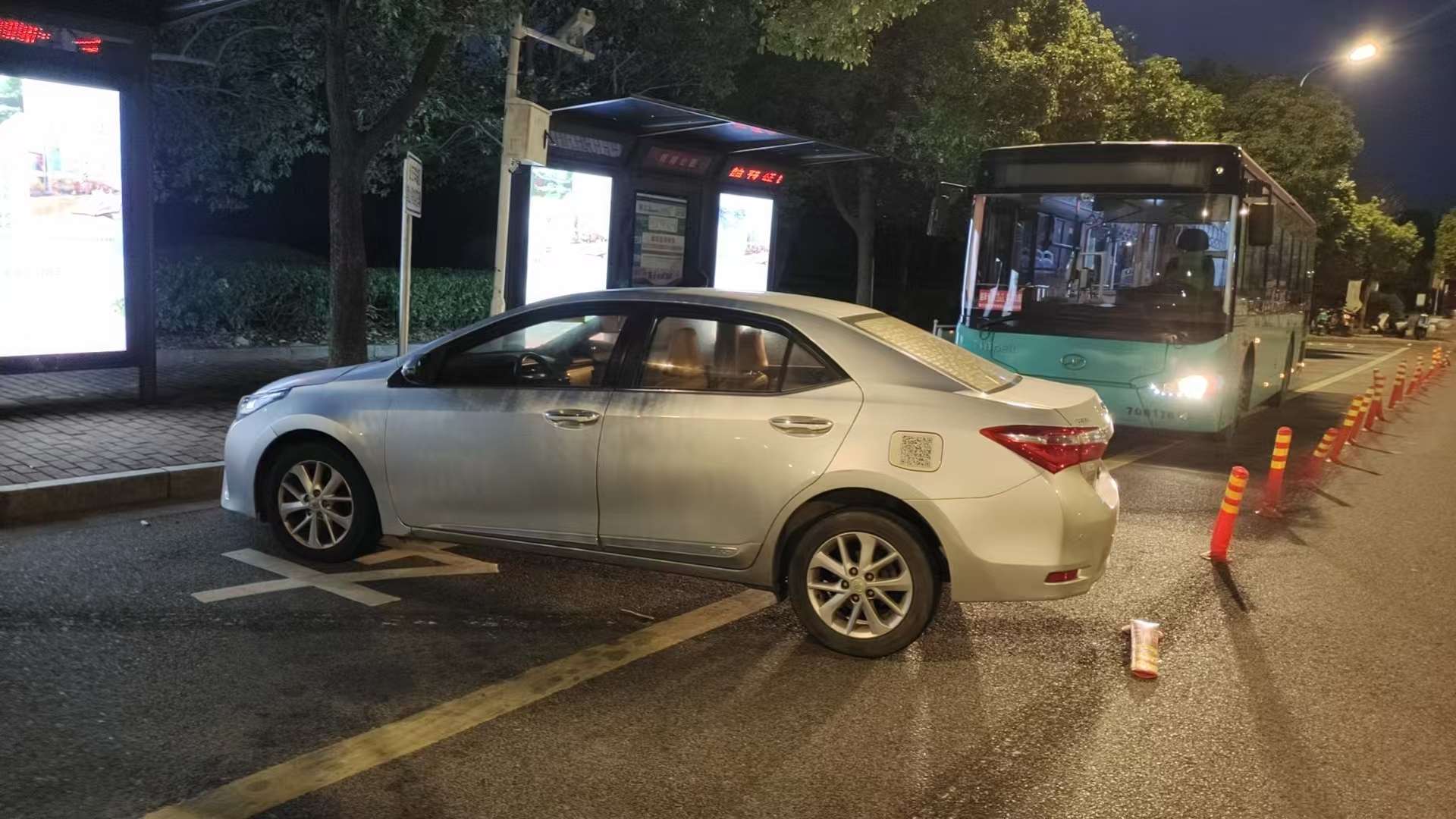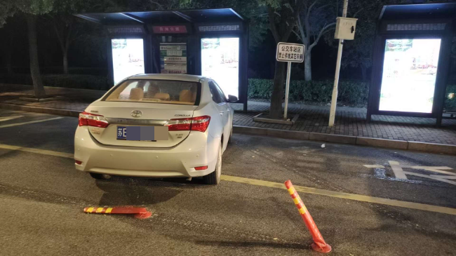 在盛泽镇舜湖公园公交首末站,这台车刚好堵在了公交站台通道的出口,公交站台区域安装了隔离警示桩都挡不住他的违停。