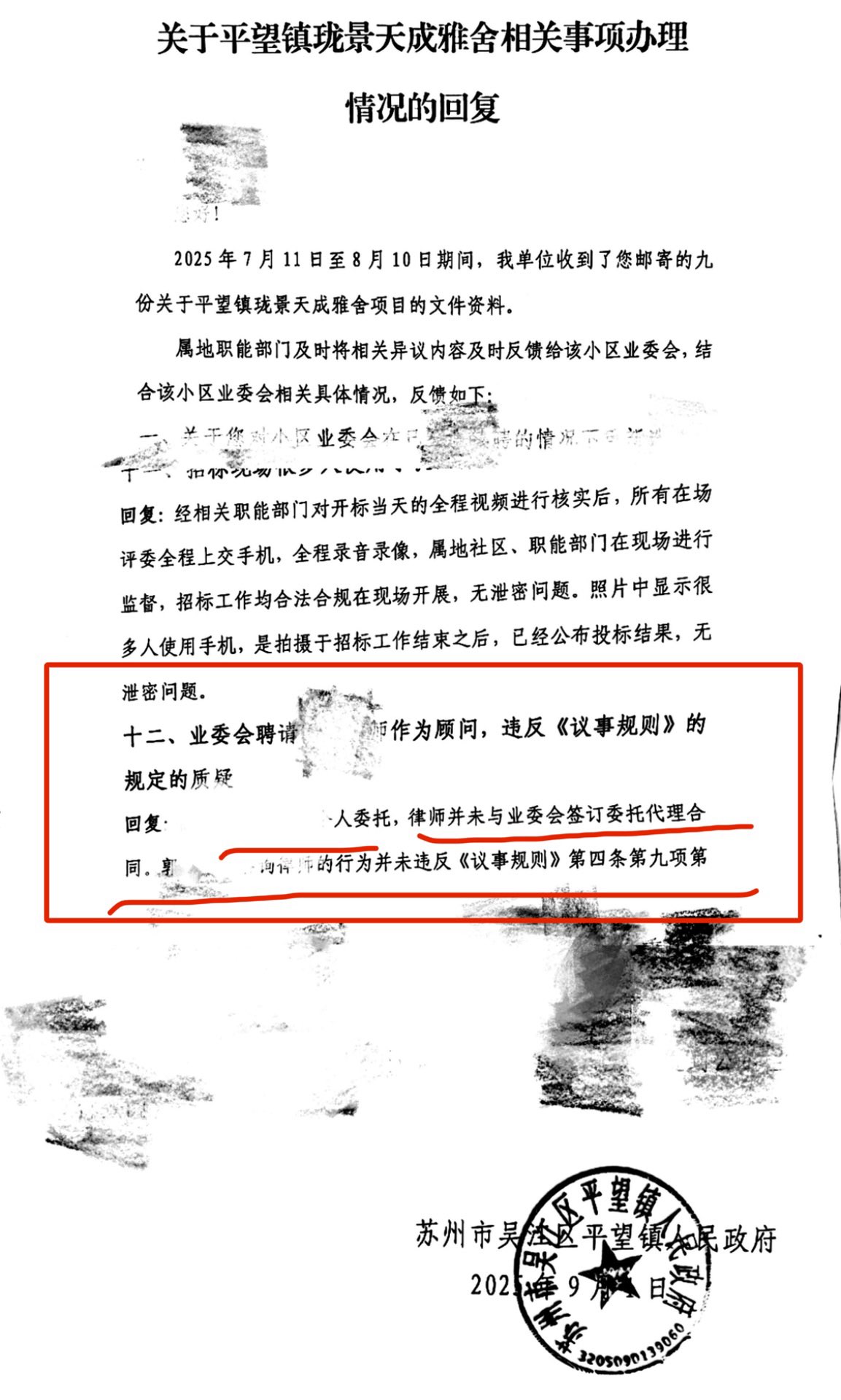 在小区业主就业委会聘请律师是否合规提出质疑后,平望镇人民政府于2025年9月3日作出的回复中明确载明:“律师系郭威个人委托,律师并未与业委会签订委托代理合同。郭威个人咨询律师的行为并未违反《议事规则》”。该回复由符某作为属地物管办负责人员参与处理并对外出具,且加盖了平望镇人民政府公章,代表着官方调查结论。