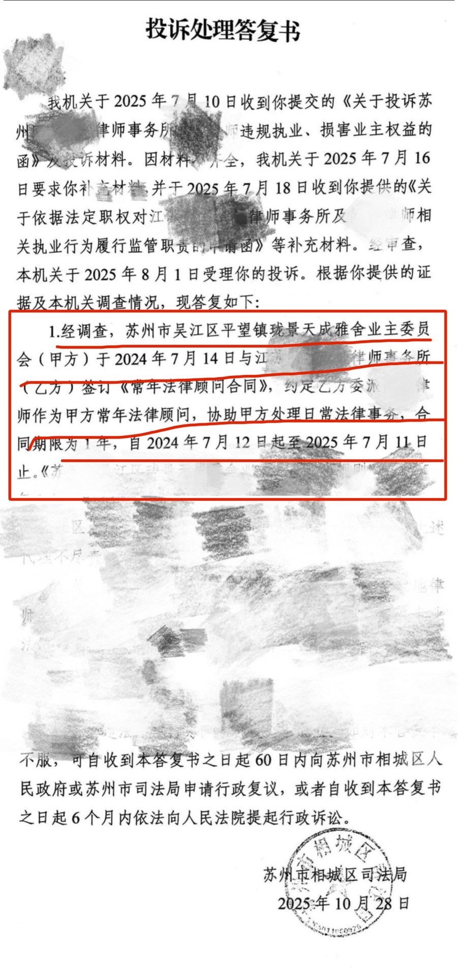 然而,苏州市相城区司法局2025年10月28日作出的《投诉处理答复书》,却以权威调查结果直接打脸上述回复:经核查,“苏州市吴江区平望镇珑景天成雅舍业主委员会(甲方)于2024年7月14日与江苏同益大地律师事务所(乙方)签订《常年法律顾问合同》,约定乙方委派律师作为甲方常年法律顾问”,且合同期限明确为2024年7月12日至2025年7月11日止。进一步证实律师系以业委会名义正式聘请,而非个人委托。