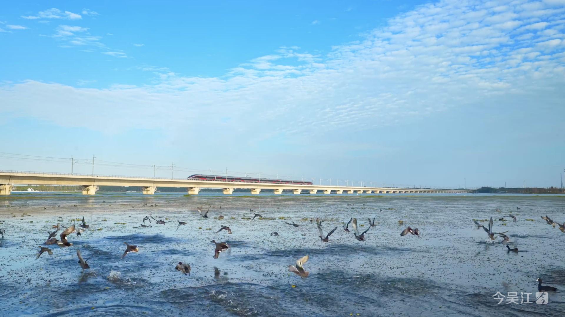 图为正在鼋荡湖面嬉戏觅食的候鸟与飞驰而过的沪苏湖高铁列车相映成趣。(汾宣供图)