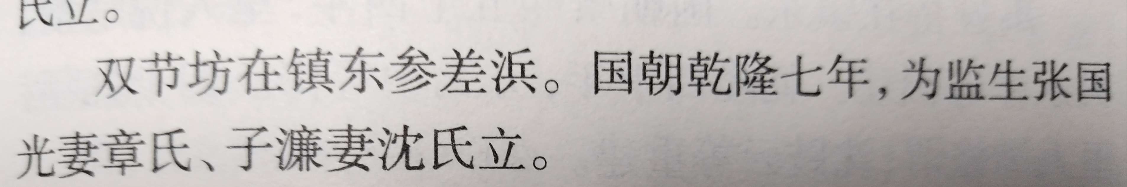 六十载前,余曾亲见震泽乡永乐村四组(参差浜)村口,旧有双节坊一座。今检《震泽镇志续稿》第八十五页所载,可考其始末:国朝乾隆七年,监生张国光为其配章氏、其子张濂为其配沈氏,共立此坊以彰二妇贞节。坊体悉以花岗岩构就,形制为三间三门,惜乎后遭拆毁,仅存文献可稽。