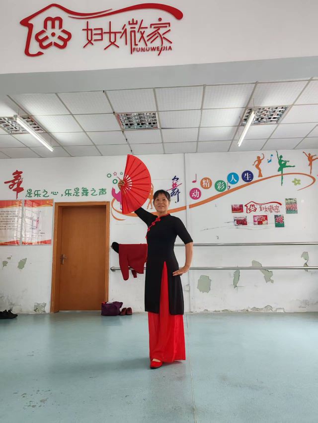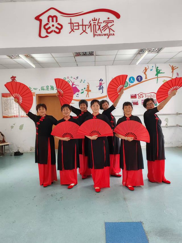 第一张照片,大家集体亮相的瞬间。队员们整齐地站成两排,手中的红折扇高举过头,或半掩胸前,脸上洋溢着自信而灿烂的笑容。她们的眼中闪烁着对艺术的热爱,对生活的热情,仿佛在说: "我们都是最棒的抗癌明星”。背景墙上"妇女微家"的字样,也为这群热爱生活的女性增添了一份温馨的力量。