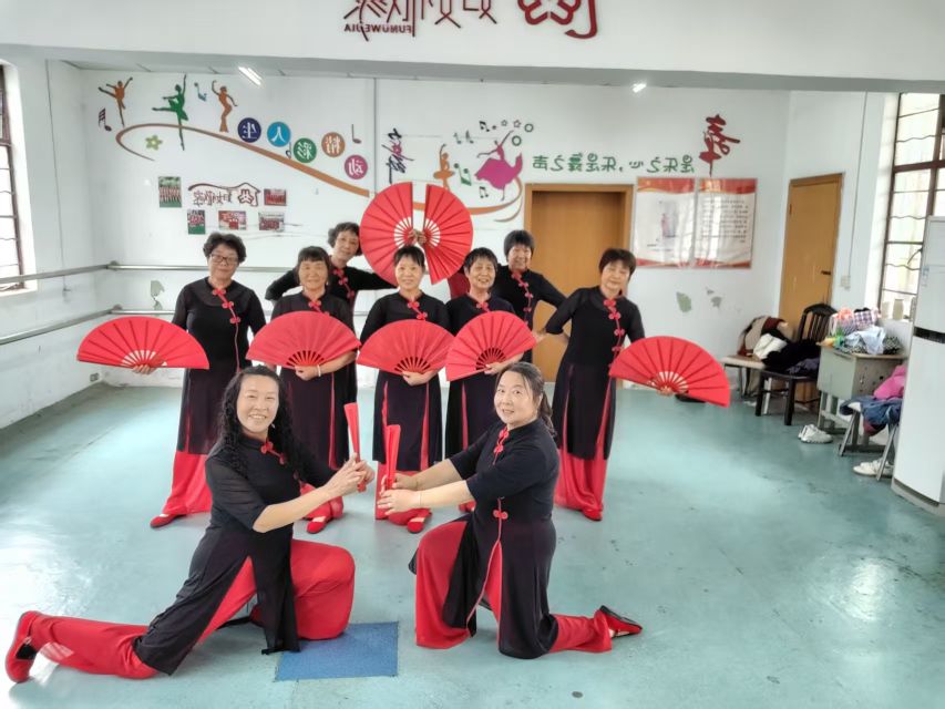 最后这张照片,她手中的红色折扇,在空中划出一道优美的弧线,与她的身姿完美融合,整体造型庄而不失灵动。她的眼神专注而坚定,每个舞姿都充满了力量与柔美:折扇在她手中时而轻摇,时而展开,每个动作都充满韵味,她的脸上挂着自信而满足的笑容,仿佛在告诉我们年龄只是数字,热爱才是永恒的动力。舞蹈室里的墙壁上装饰着"舞是乐之心,乐是舞之声"的字体,还有“精彩人生”等充满正能量的标语以及各种舞蹈姿态的剪影,这些装饰不仅为舞蹈室增添了艺术气息也激励着每一位学员在这里尽情挥洒汗水,绽放自我。虽然墙壁有些斑驳,却丝毫不影响这里散发出勃勃生机。