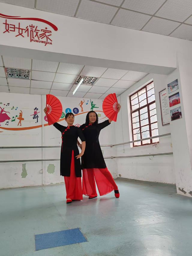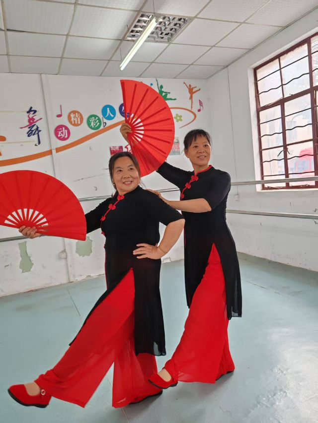 近距离观察这两队员,她们的舞姿更加舒展,一人侧身而立、一手叉腰,一手持扇高举;另一人则轻柔地将手搭在前者的肩上,两人相视一笑,眼神中充满了姐妹情谊和表演的喜悦。红色的裤子随着动作飘逸与黑色的上衣形成鲜明对比,更是灵动。