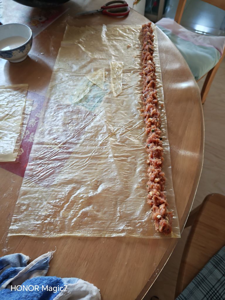 然后8元买了段草鱼,放进肉馅里才不柴、8·5元一颗小冬笋,又去祖名豆腐店买了半斤豆腐衣28元。回家路上盘算着:千张氽了太硬,还是这豆腐衣妥帖,虽贵些,胜在轻薄如蝉翼。