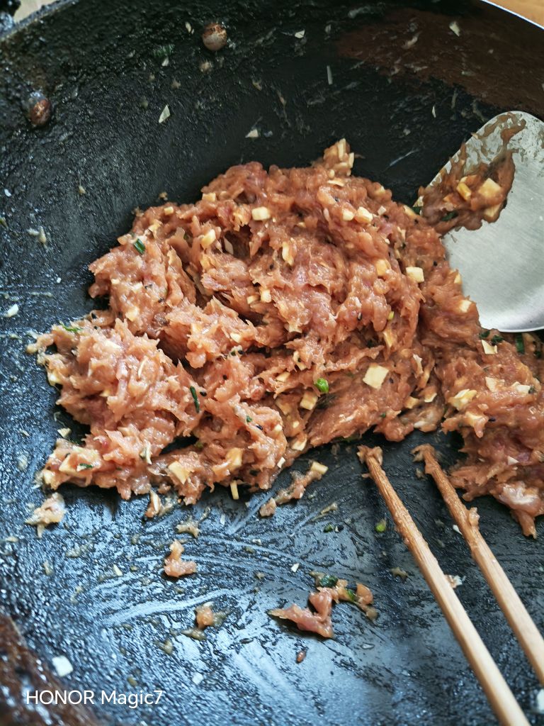 洗净的肉控干水分,取出我那台绞肉机,绞肉机欢快地唱着歌。将肉糜与冬笋粒、黑芝麻、葱粒,姜粉,添上蛋液、胡椒粉、少量鲜酱油,再分次注入冷开水,顺时针搅打时,胳膊渐渐发酸。这肉糜真是倔强,搅到后来变得黏糯,泛着琥珀色的光泽。