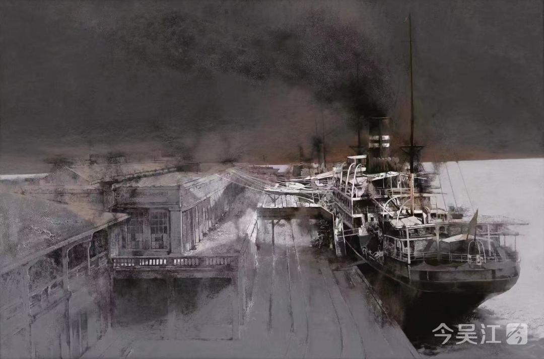 斩获“文华美术奖”的粉画《回声》,出自艺术家钱兆峰之手。作品以黑白灰为主色调,辅以橘褐、月白、黛蓝等色彩点缀,通过精准的物象捕捉与虚实相生的画面处理,重构江南码头的历史记忆。创作者将码头缆绳转化为交织的曲线网格,水面波纹提炼为平行笔触的律动,以“半抽象”的艺术手法突破具象束缚,在“绘形”与“造境”的平衡中营造出历史的厚重感与距离感,引发观者强烈的情感共鸣。