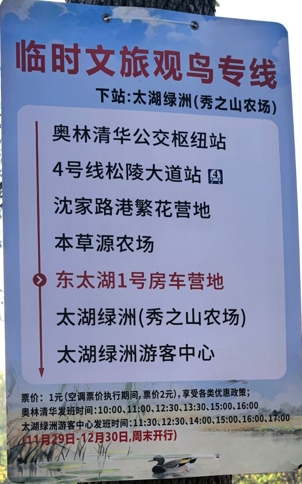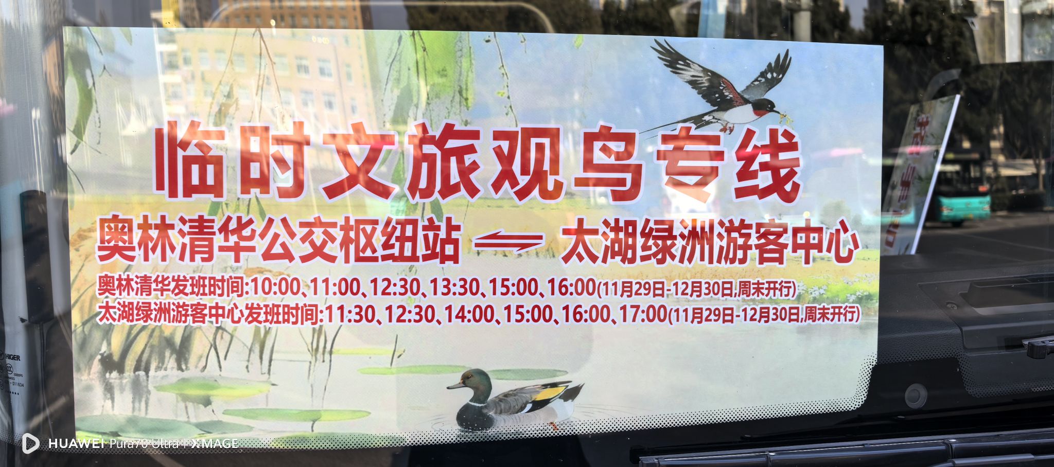从11月29日到12月底,为方便群众休闲观鸟,逢每周六,周日开通观鸟专线。在奥林清华枢纽站发车。发车时间及线路见下图!
