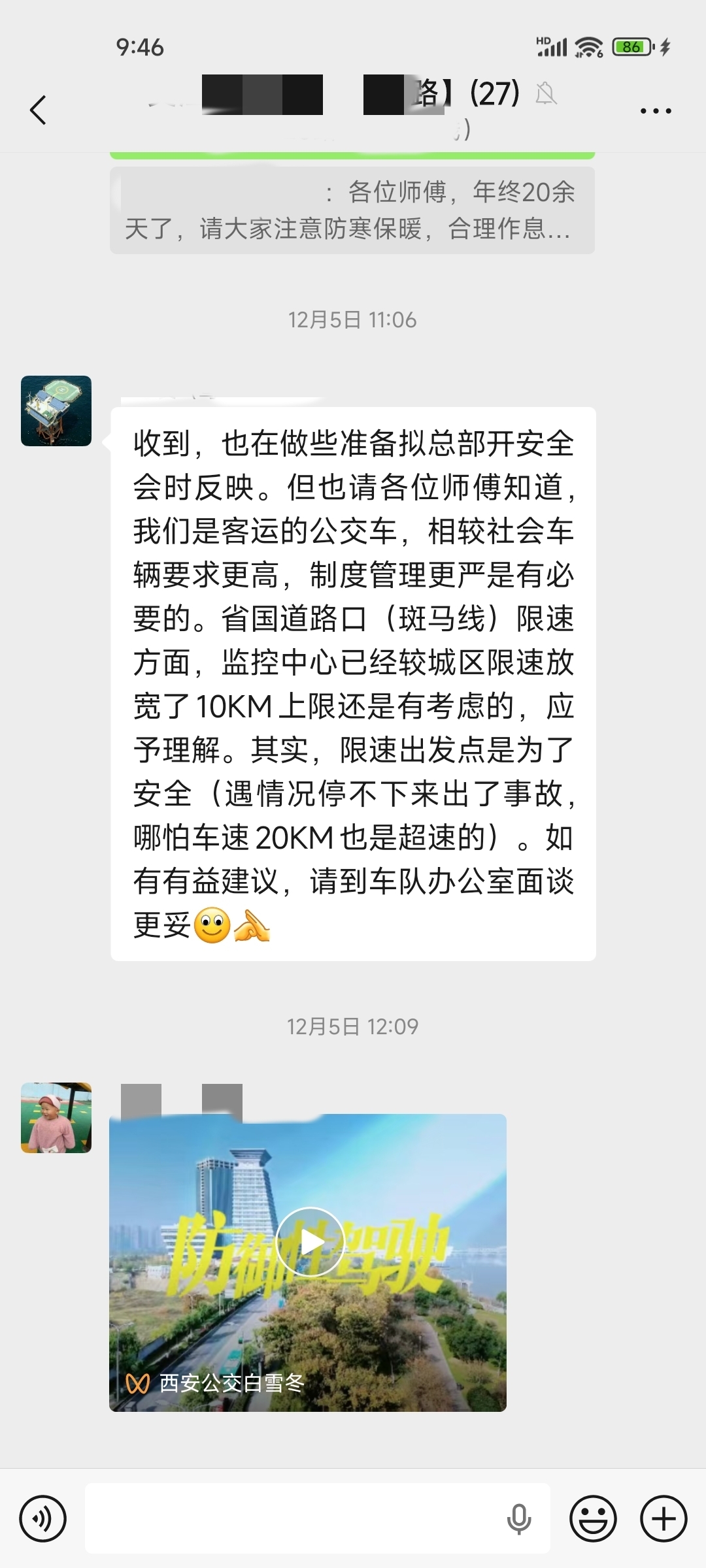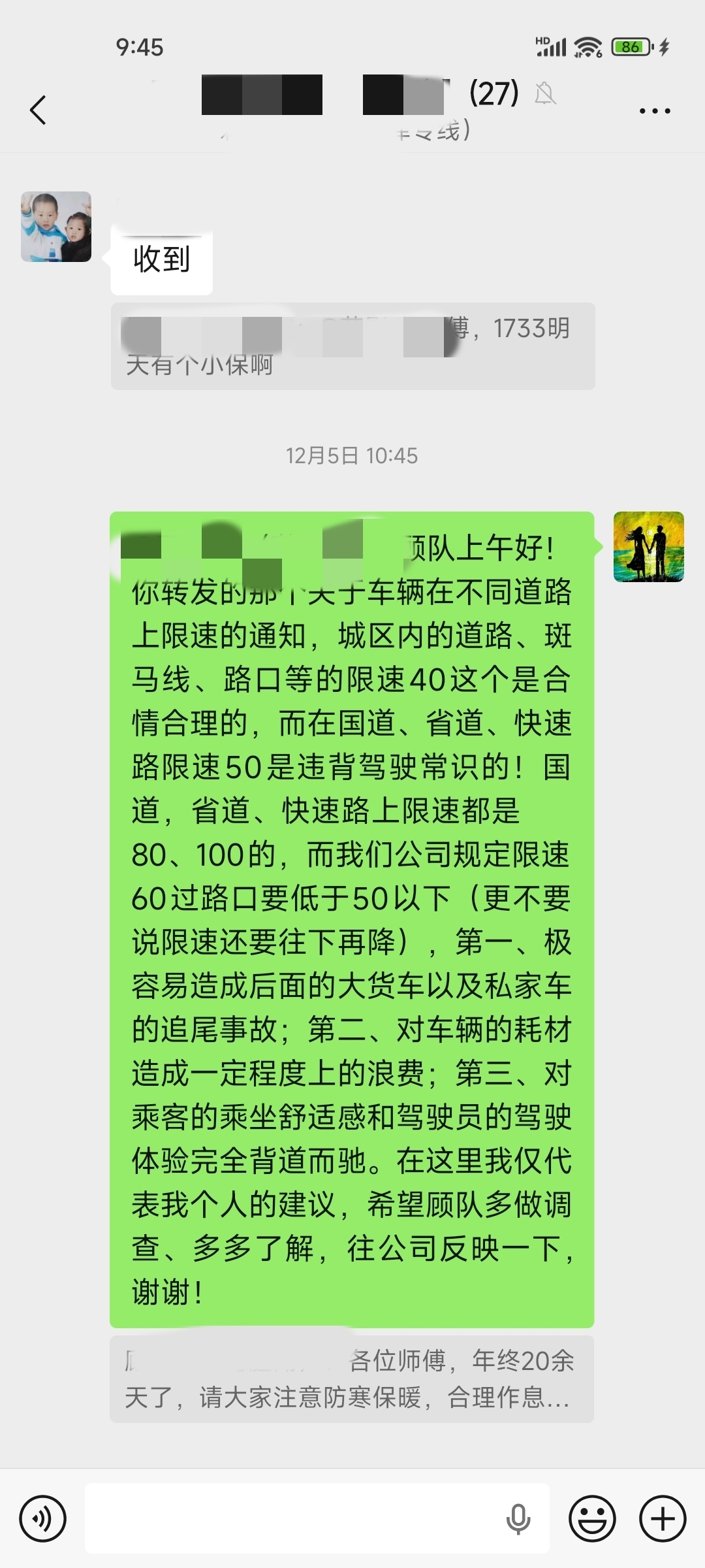 又有驾驶员在工作群里发条建议,车队在回复时说:“如有有益建议,请到车队办公室面谈更妥!”