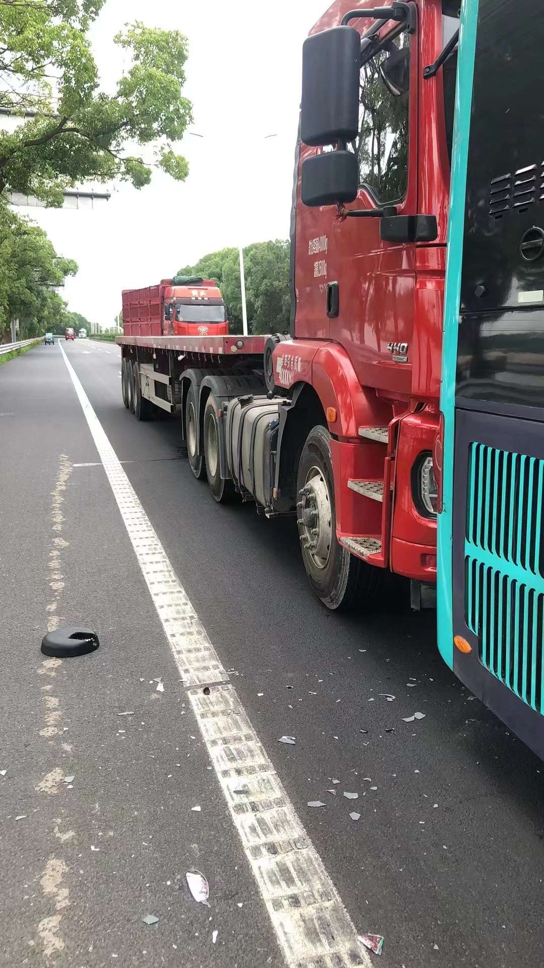 视频中的公交车在限速80的国道上靠右正常行驶,这其间,有一辆白色的“货拉拉”从他左边车道超了过去,而他的后方正是那辆后来出现在视频中的急促而来的油罐车。