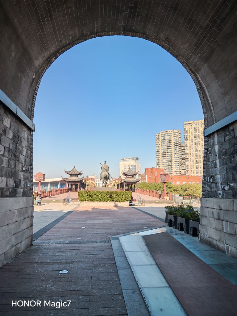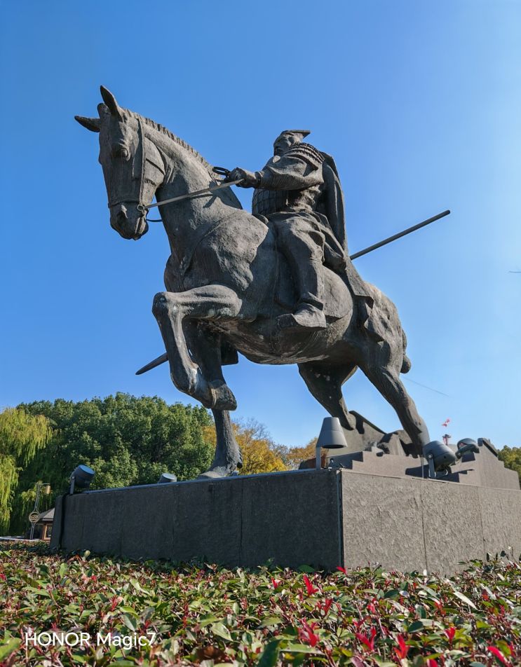 穿过城楼的圆拱门,青铜铸就的项王立马雕塑便撞入眼帘。他左手紧握长戟,右手勒住马缰,战袍下摆被风掀起,仿佛仍在乌江畔猎猎作响,眉宇间的刚烈与悲怆,凝住了千年前的那份孤勇。