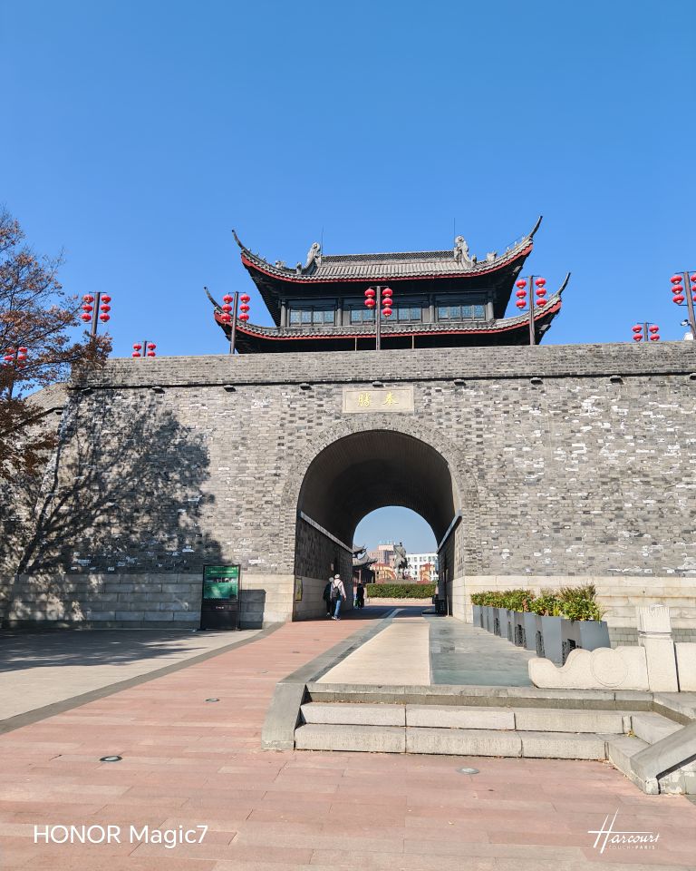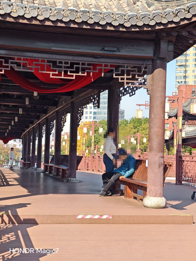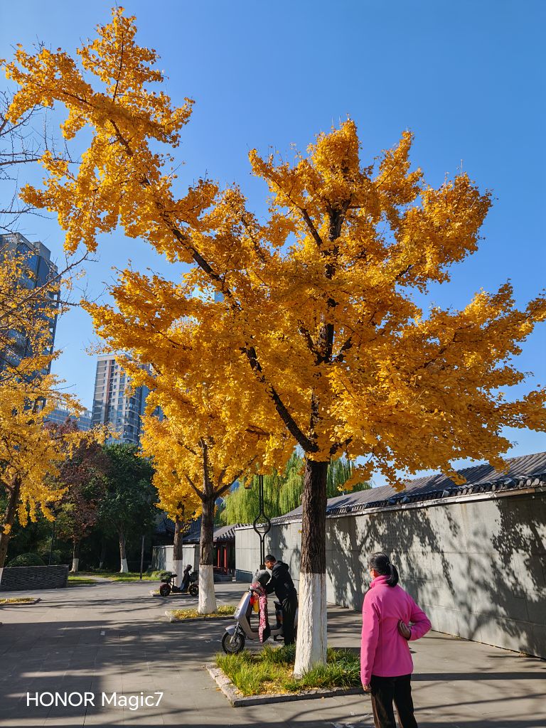 走完城楼圆拱门西侧的银杏林,早已铺就一片金黄。叶片像被阳光镀了层金,风过时簌簌飘落,铺在地上如碎金满地。林边长廊传来悠扬的笛声,一位银发老者闭着眼,手指在竹笛上翻飞如蝶,《梁祝》的旋律裹着暖意,与银杏叶一同轻舞。