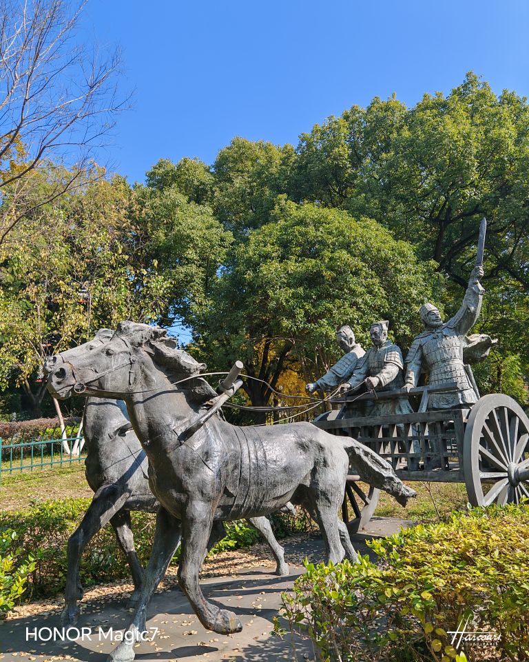 日头爬到头顶时,我在长廊里闭目养神。阳光穿过廊柱的间隙,在地上织出金色的网,暖得人心里发酥。骑上小电驴返程时,后视镜里的项王雕塑静静立着,仿佛在目送每个过客。这座公园就像本摊开的书,历史的厚重与现实的鲜活在字里行间交织,生命的坚韧与时光的从容地低语,正如桥下的苕溪,永远在流淌,永远在诉说。