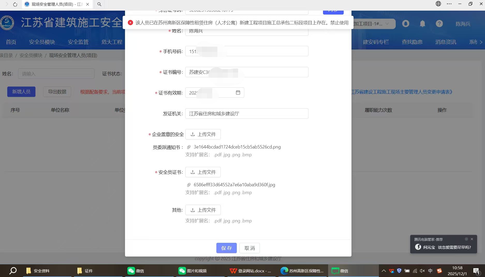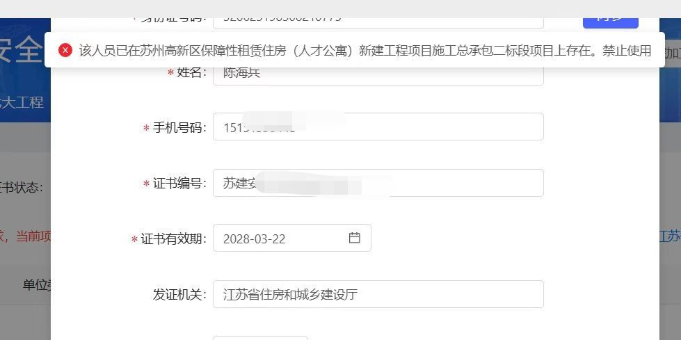 大家好,本人叫**,是江苏省如东县人,我曾在苏州中港建筑有限公司工作过,岗位是安全员,但我2022年3月份因母亲重病去世而离职,后来苏州中港的新项目我就没去过,但中港建筑公司未经本人同意,擅自将本人的安全证挂在后来的苏州高新区保障性租赁住房(人才公寓)新建工程项目施工总承包二标段项目上使用,(该工程已经结束了)直到今年的12月份我的安全证在《江苏省建筑施工安全管理系统》上想注册到新的公司上,上面显示我的证在苏州高新区保障性租赁住房(人才公寓)新建工程项目施工总承包二标段项目上使用,关键问题是我根本就没去过那个项目,后来我多次联系苏州中港建筑有限公司,经过他们处理后,我的安全员证才迁来,但现在存在以下几个问题。