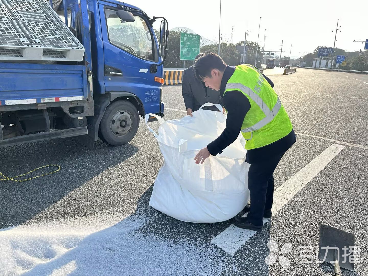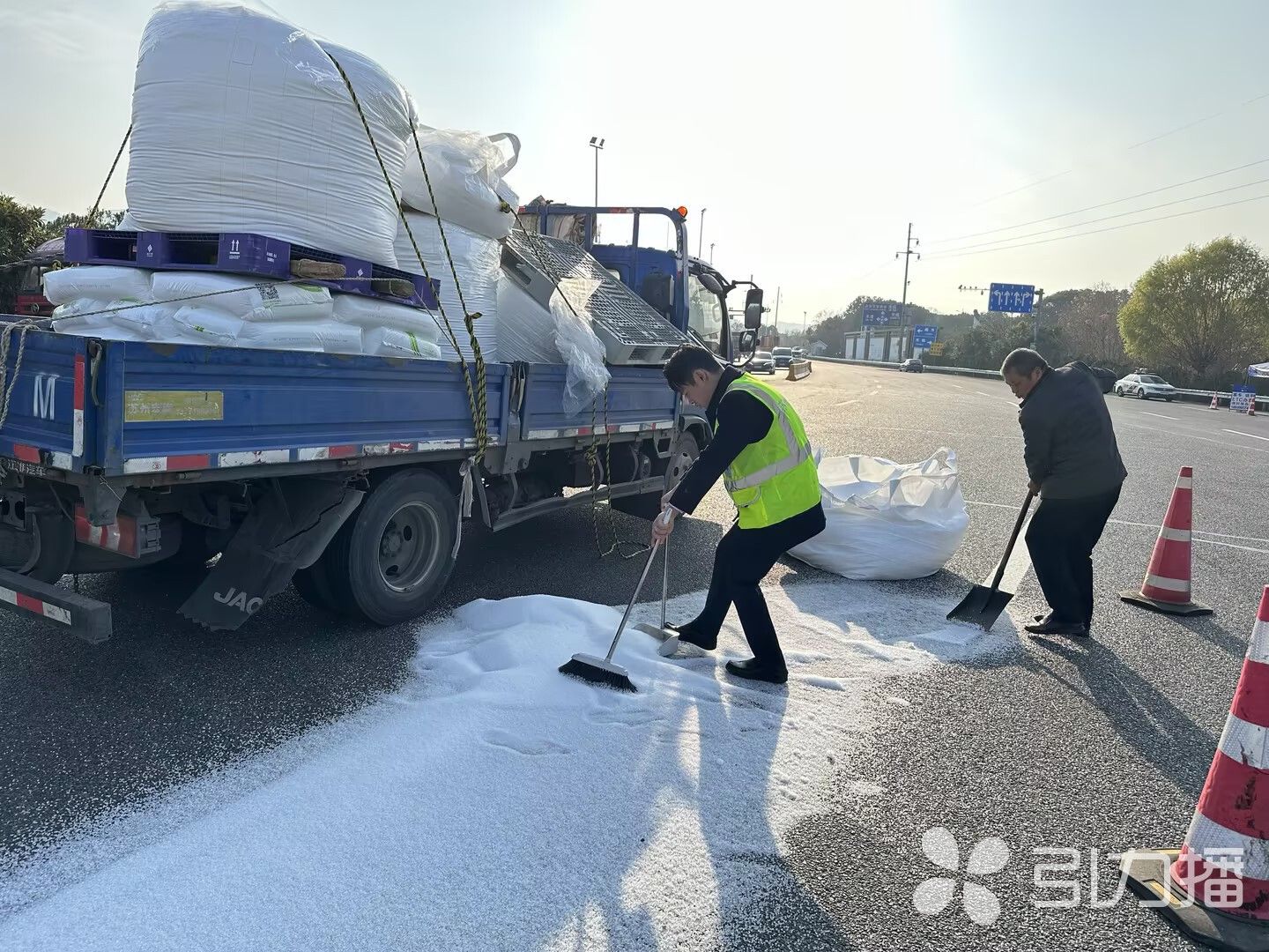 当天,一辆轻型货车驶出收费站时,车上捆绑工业原料的绳索突然松动,大量白色颗粒状原料倾泻而出,铺满车道,部分包装袋卡在车头与护栏之间,严重影响后续车辆通行。面对驾驶员的焦急与困境,正在巡查的收费班长胡丹立即上报情况,并果断关闭该车道,安排收费员蒋峰摆放锥桶、引导车流,避免次生拥堵。