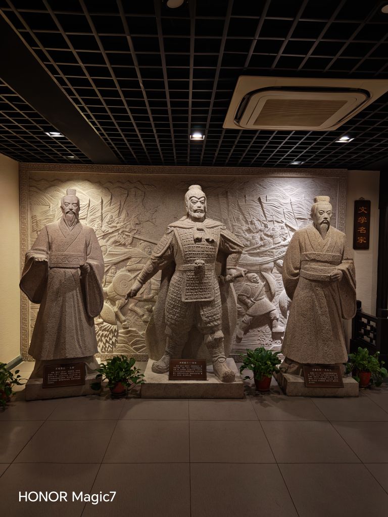 这里还藏着湖州的"宝贝":宋元明清的湖州镜泛着幽光,德清羽毛风筝似要振翅,长兴紫砂壶透着温润,羽毛扇轻摇间似有清风;织里刺绣的针脚比发丝还细,绣出的花鸟仿佛下一秒就要活过来。墙上的名人谱更让人肃然起敬:霸王项羽的英武未减。