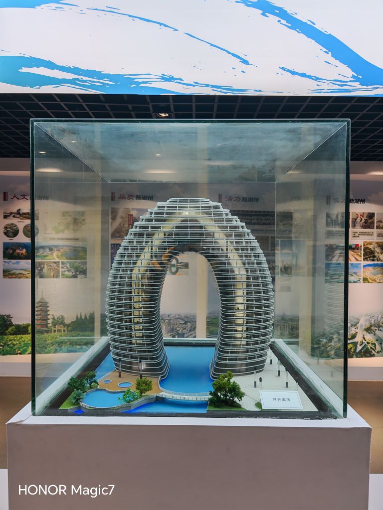 近代的钱三强、屠守锷、叶培建等科学家的事迹熠熠生辉——他们是"两弹一星"的元勋,是航天事业的脊梁。还有革命功臣的事迹、新时代英模的故事,王启民的铁人精神、王伟的海空壮志,与红船精神的展板交相辉映。玻璃柜里,东湖银泰城双子塔、太湖月亮湾酒店、飞英塔的模型摆放在玻璃柜子里,新旧景致在此相拥。