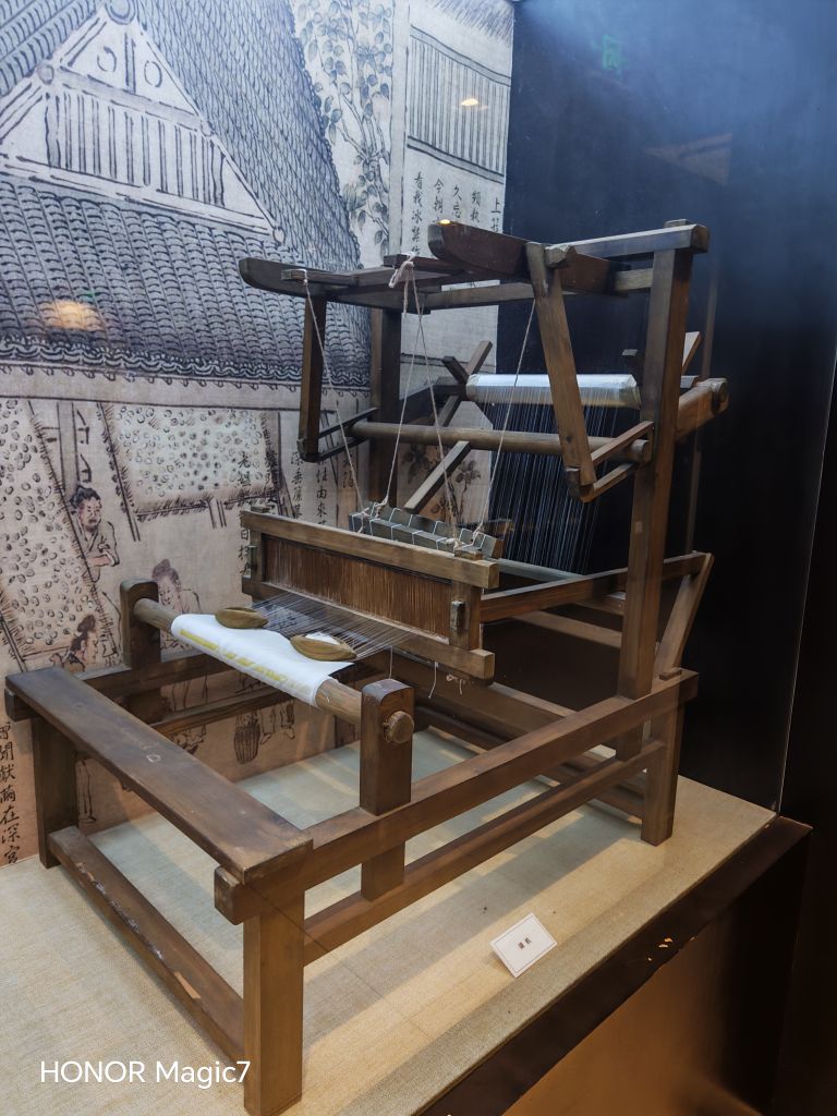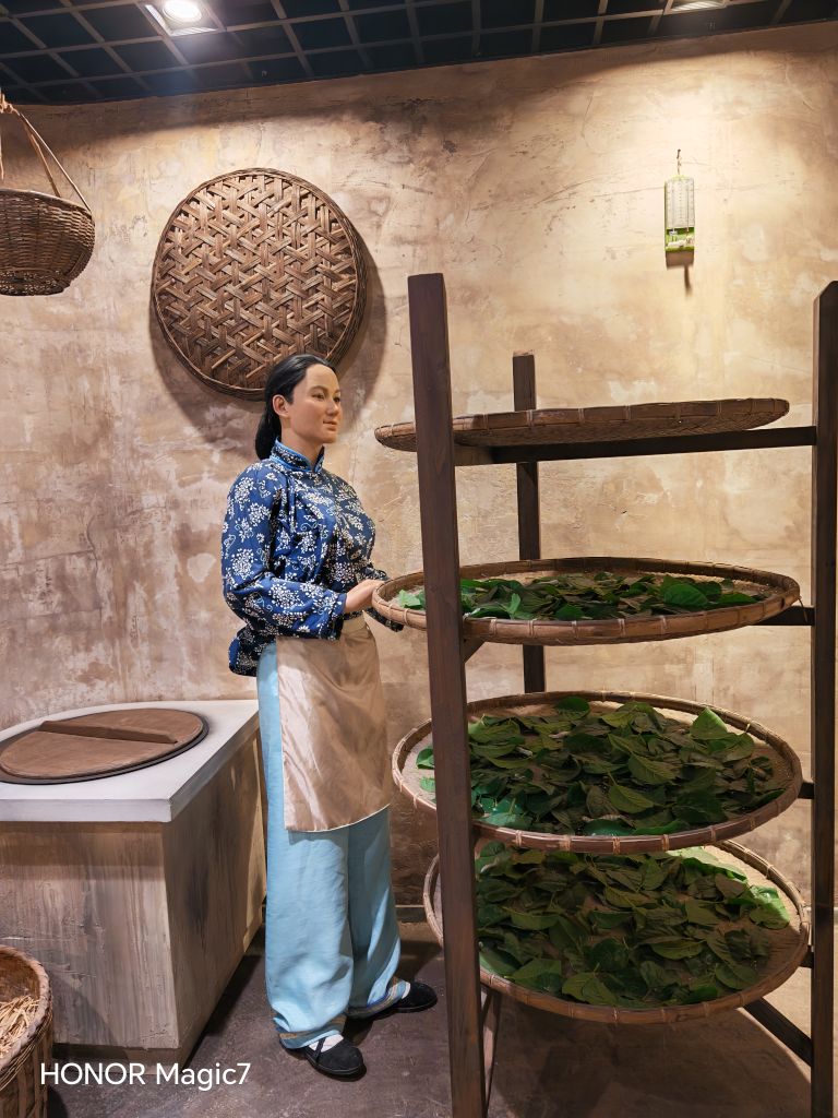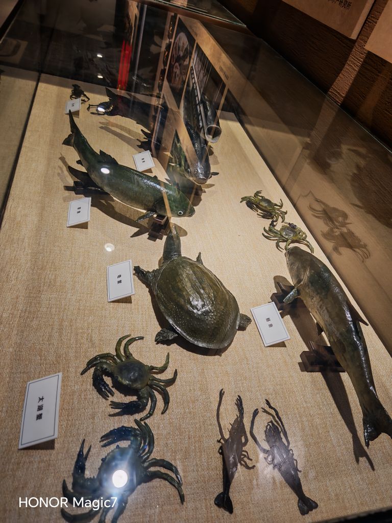 墙上的图文并茂则铺展开一部湖州简史:钱山漾遗址、邱城遗址、七里亭遗址……一个个名字串起时光的链条。玻璃柜里,鱼虾龟鳖的模型栩栩如生,仿佛刚从苕溪里钓上来;江南水乡微缩景观更是精妙——古人临河浣衣,木船在河里穿梭,街头叫卖声似在耳畔,满是"苏湖熟,天下足"的烟火气。那里,蚕娘正低头给蚕宝宝喂桑叶,织布机上缠着流光的绸缎,连玉米、黄豆的模型都带着沉甸甸的颗粒感。
