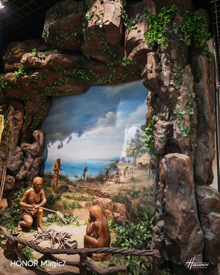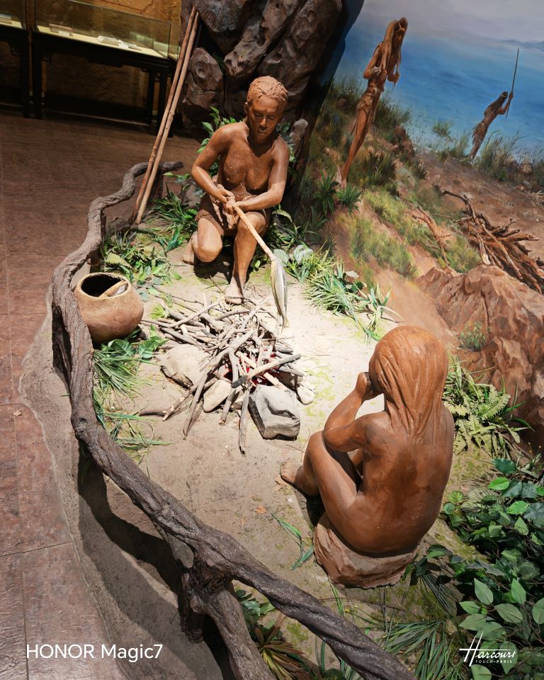 我在里面转来一圈出来问保安"就这些?他指了指电梯:"地下室和二楼更有意思。"乘电梯往下,地下室灯光昏黄,热空调裹着股陈旧的气息扑面而来。最惹眼的是处景观:"毛仙石头"垒成的山洞旁,远古先民赤身围坐,正举着木棍挑着鱼烧烤——柴火堆里亮着红光,原是底下藏了红灯,旁边甏里还卧着两条待烤的鱼,活灵活现得像要蹦出来。