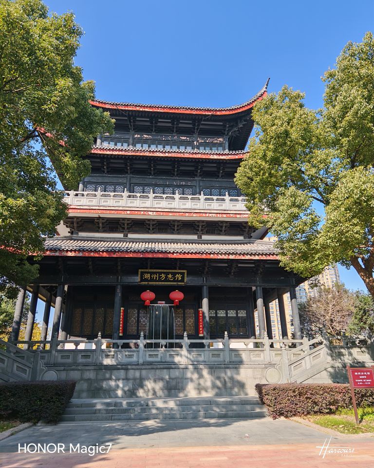 那天从项王公园回家,上午10:30的日头正烈,给苕溪水面镀上层碎银似的光。路过北门水闸旁那栋飞檐翘角的四层建筑时,脚步不由得停了——它像本被岁月摩挲得温润的线装书,青砖黛瓦间藏着说不出的吸引力。我支好小电驴,决定进去探探。
