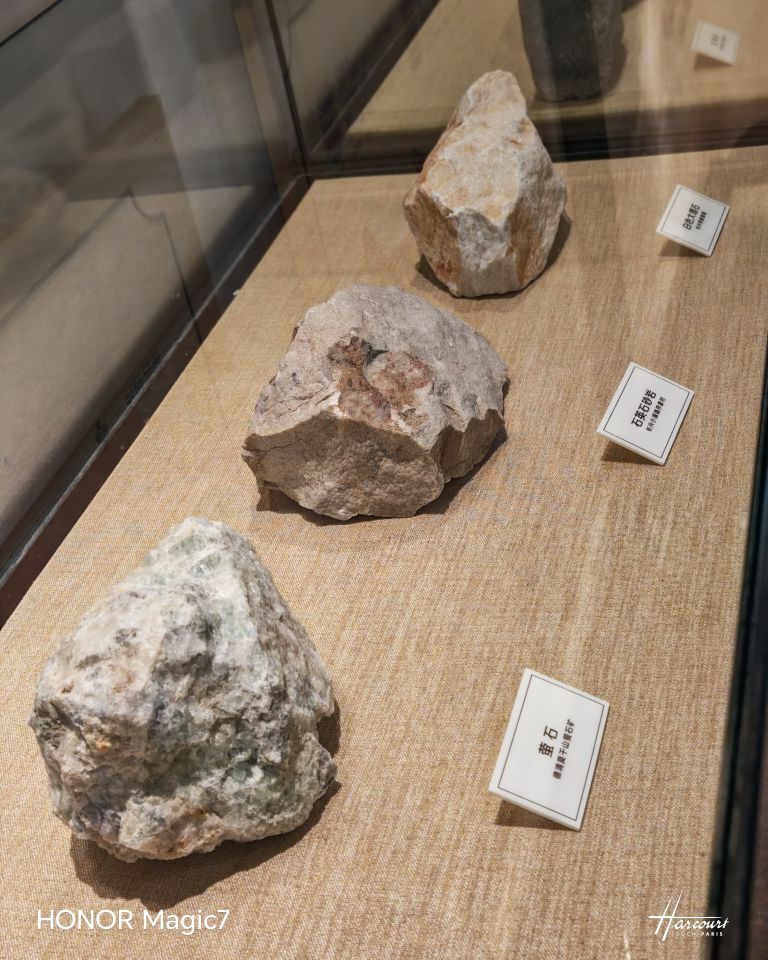 拐进一楼大厅,映入眼帘的玻璃柜先勾住了我的眼:三块石头静静躺着,分别标注着"德清莫干山萤石矿的萤石"、"长兴小浦镇乔家村的石英砂岩",还有块莹白的大理石,泛着细腻的光。墙上挂着矿石分布图、旅游名胜图,山水脉络与景点标记清清楚楚,倒像张立体的湖州名片。