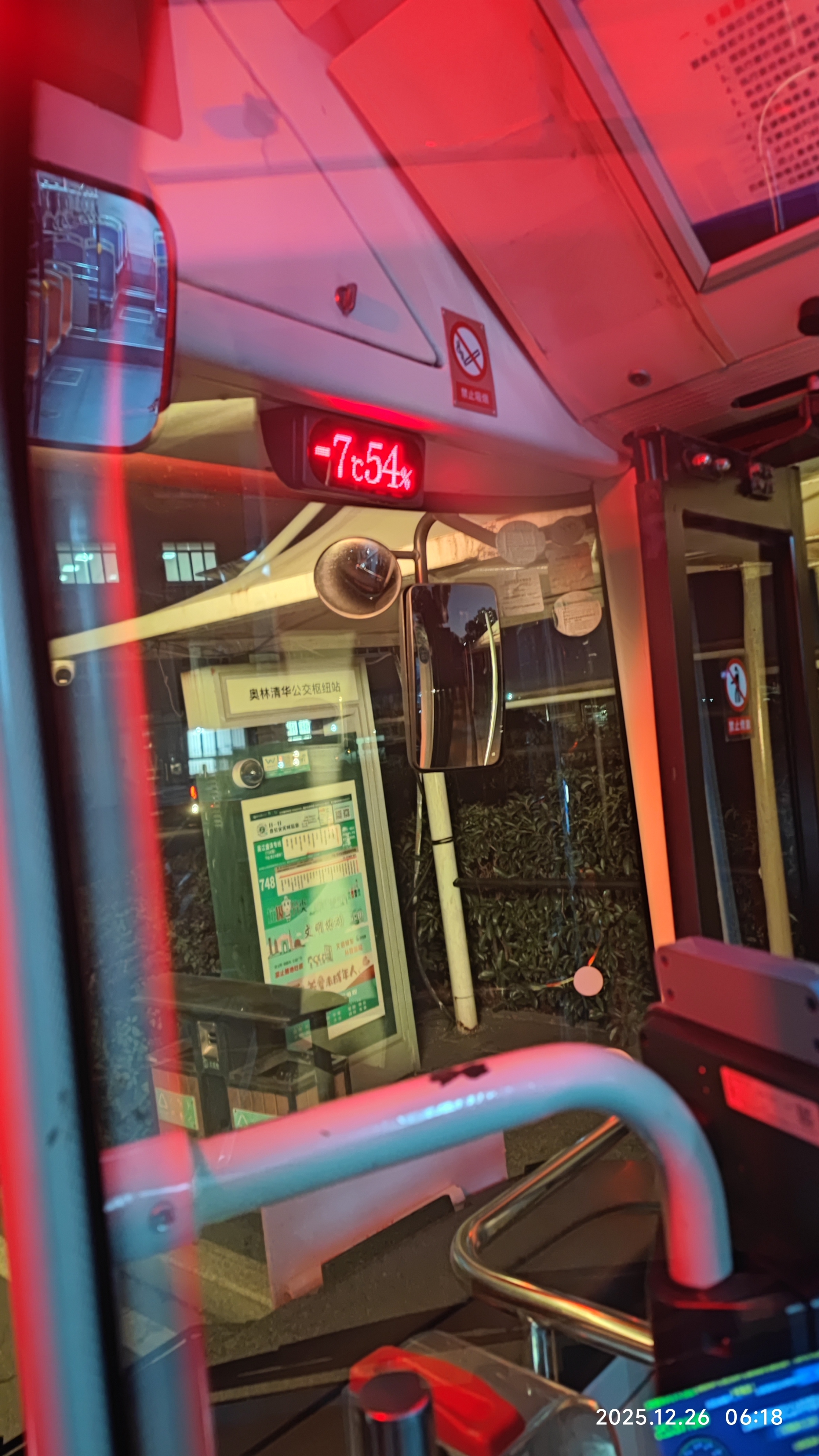 今天早上我是6:20的班次,到车队后我把车子检查了一遍,然后把车子启动起来一边预热着,一边习惯性的抬头看了一下车内的温度显示器(见上图),这一看不打紧,上面显示的竟然是 -7℃,这也太夸张了吧!