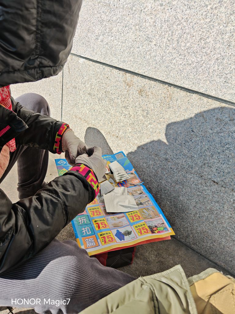 午后的阳光浓得化不开,我们在一个没风的地方上晒着太阳。老伴开始制作祭祖用的银元宝,锡箔纸在她指间翻飞,像极了我们拆解红包时的敏捷。远处传来鸟鸣声混杂着汽车的轰鸣,这市井烟火气里,藏着比任何算法都精妙的生存智慧。