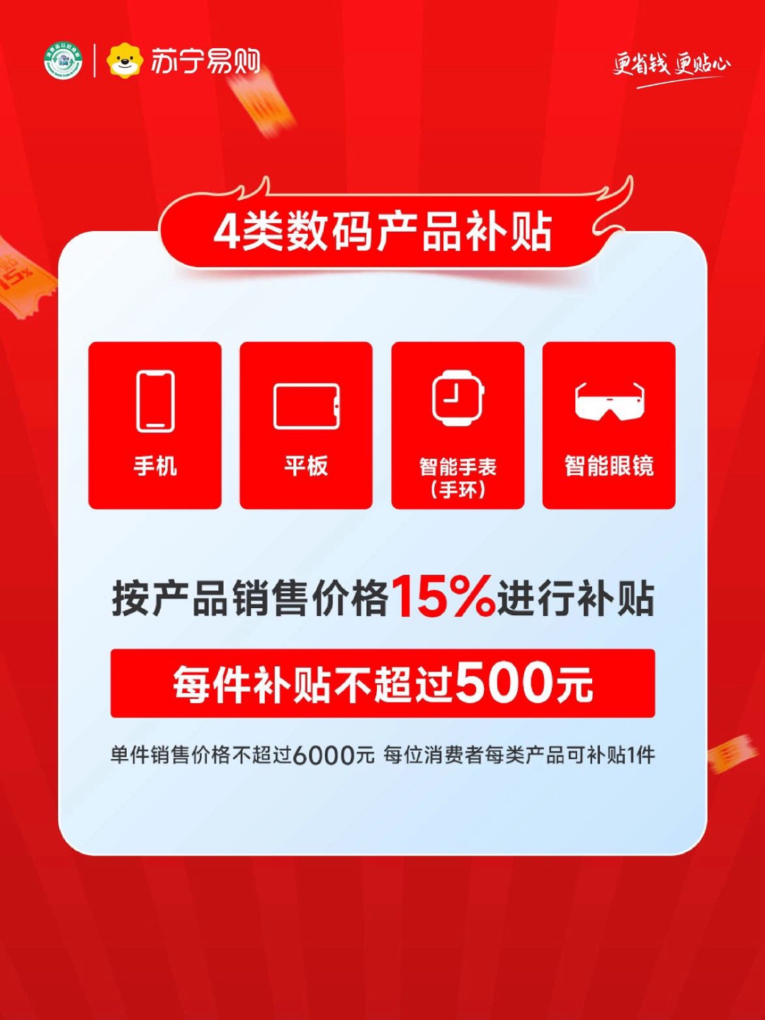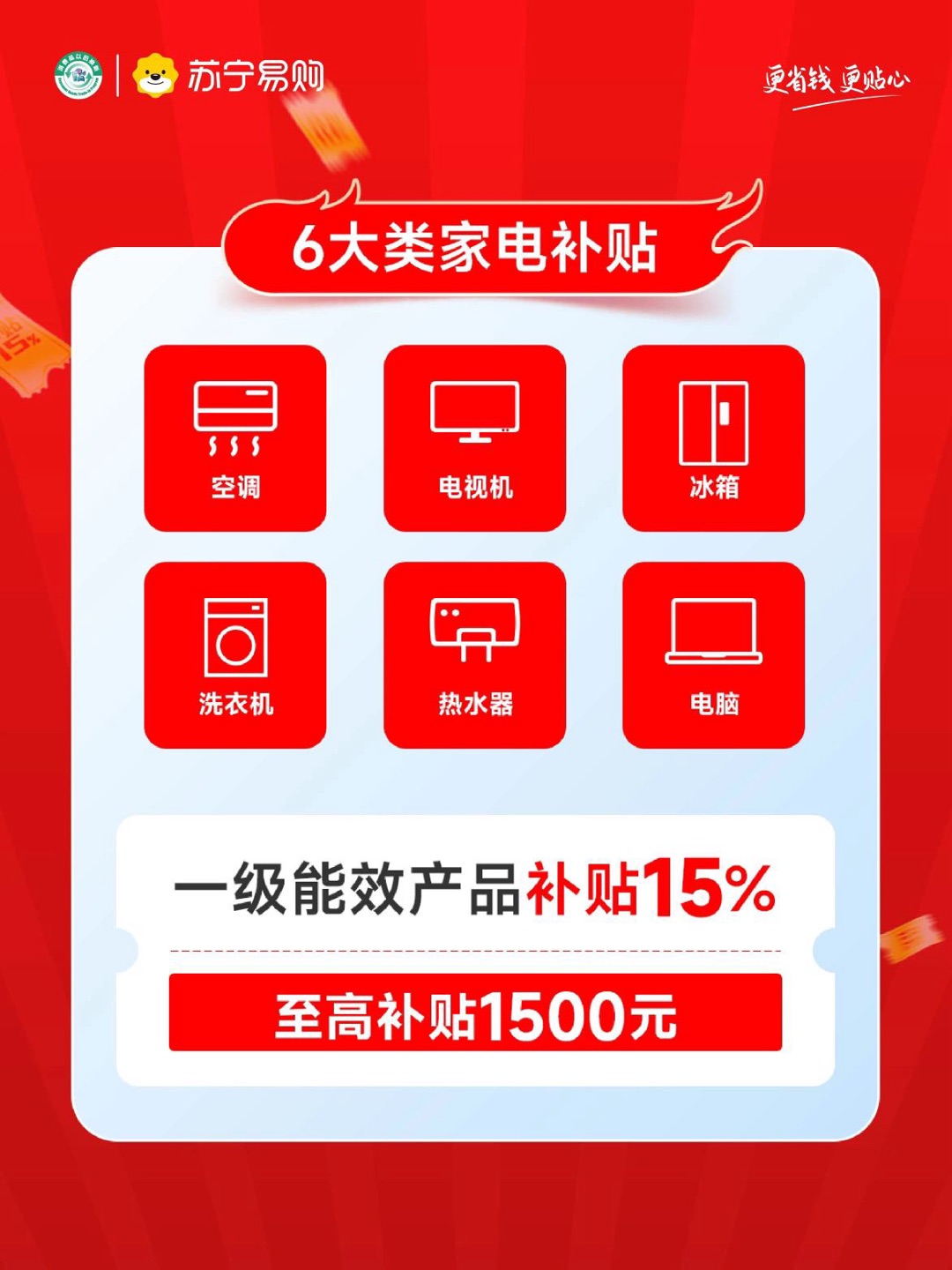 家电补贴:冰箱,洗衣机,空调,电视,电脑,热水器6大类;一级能效15%,至高1500元3C类补贴:手机,平板电脑,智能眼镜,智能手表(手环);6000元以下补贴15%,至高500元。