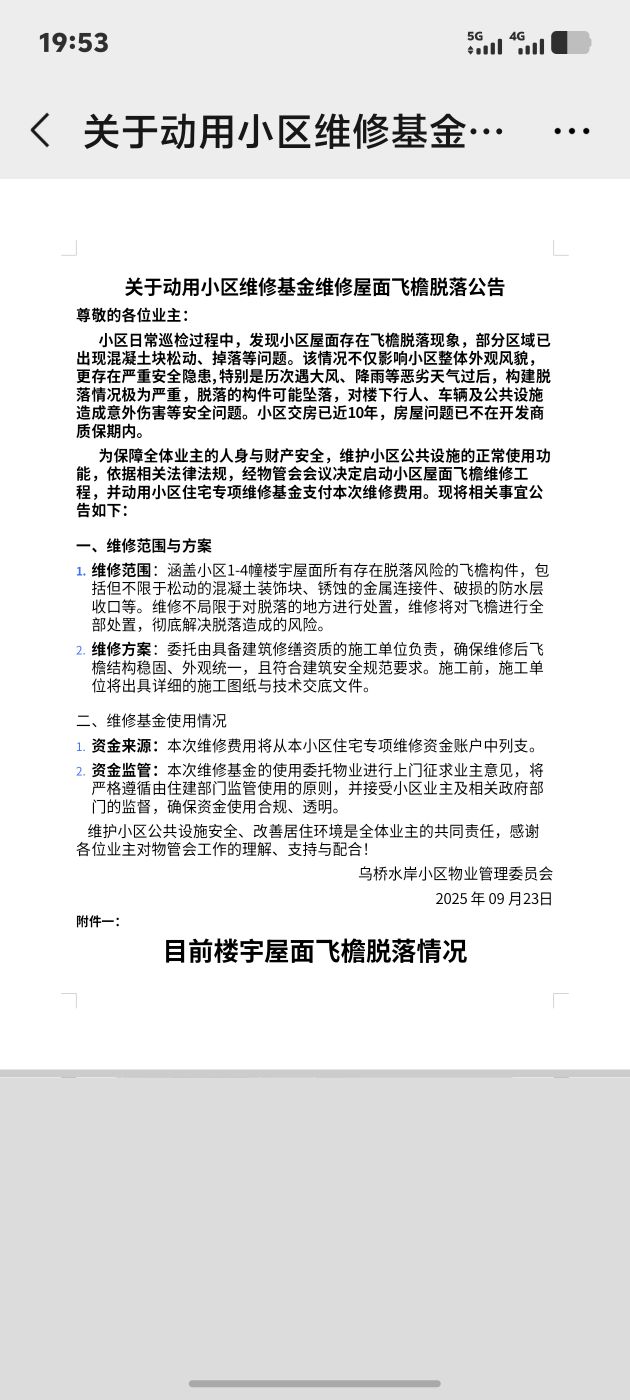 我是乌桥水岸普通业主,真心爱家。此前投诉物管会违规动维修基金修飞檐,你们答复提了业主表决而非仅征求意见,有进步,但9月23日的违规公告该不该撤销?你们只说物管会可发起、业主表决,却不回应核心质疑,这就是敷衍履职、避重就轻!