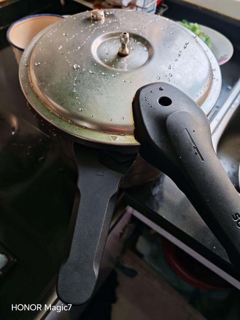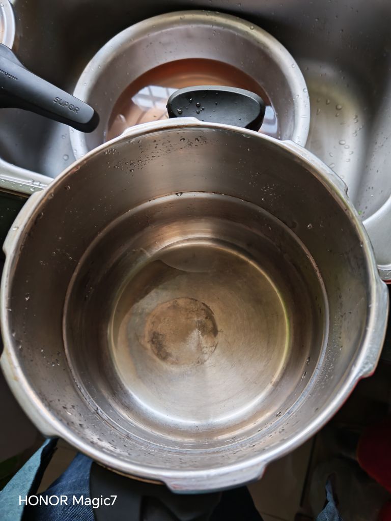 没承想晚饭时老伴又闯了祸。新买不久的“苏泊尔”不锈钢高压锅,下层蒸着碗梅干菜五花肉,架上叠着米饭和玉米,她守着电视追剧,愣是忘了灶上的火。等闻到焦糊味冲进厨房,锅底早已烧得通红,下层的碗裂成了蛛网,上层的米饭结了层黑硬的锅巴,玉米焦得像炭块。万幸安全阀还在喘气,没闹出爆炸的险事。"那爷"捏着钢丝球蹲在水池边擦了半天,锅内壁的焦块总算磨掉了,却留下圈深褐色的印子,像道洗不去的疤。