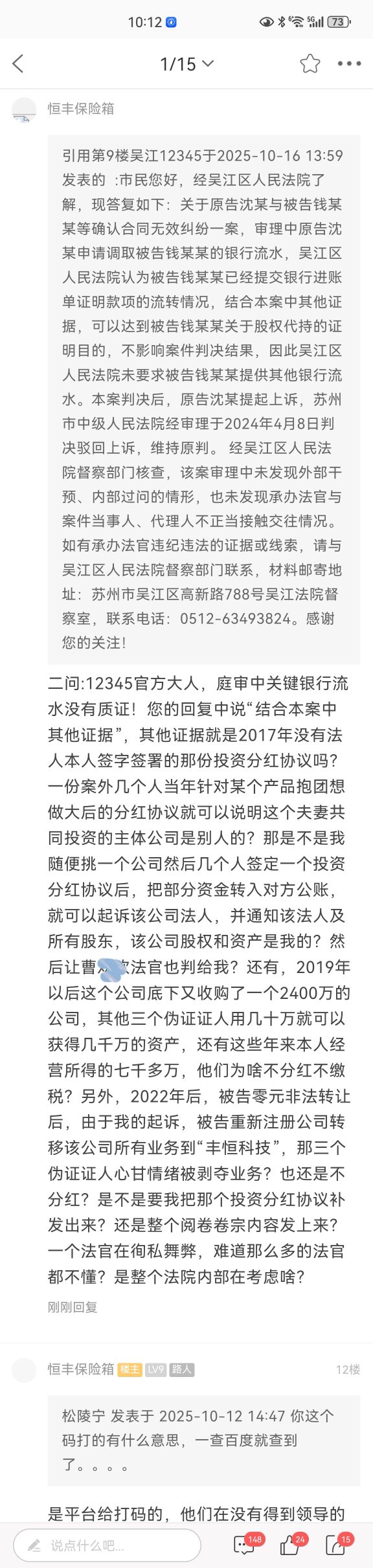 前段时间,本人发了个贴,指向法院某法官涉嫌徇私舞弊,指鹿为马,业务水平拉胯,导致了本人合法权益7000多万被人做局抢走,在当今这个一直追求法治公平正义的新社会居然还有如此胆大包天的人,不寒而栗!此前也得到了12345官方大人未彻底了解案情就和稀泥式的恢复,本人深表遗憾。今日,本人就政务服务平台回复也做了相应的回复,见下图!我知道,投诉也好,举报也好,都是每个公民应尽的义务,但是要以事实为主,公开投诉是双刃剑,一旦判离事实,就有可能割伤自己,我深谙这个道理,也有勇气对事情敢于发声,请广大网友给我评评理!如果想了解投诉始末,请搜索“这种法官”就可以找到原帖子,法院里也有好几个认识的熟人,他们看了卷宗,不理解为啥这个法官会这么做,为啥现在的法院系统里的领导干部如此不作为?敢于如此不作为?原贴今天回复内容截屏如下