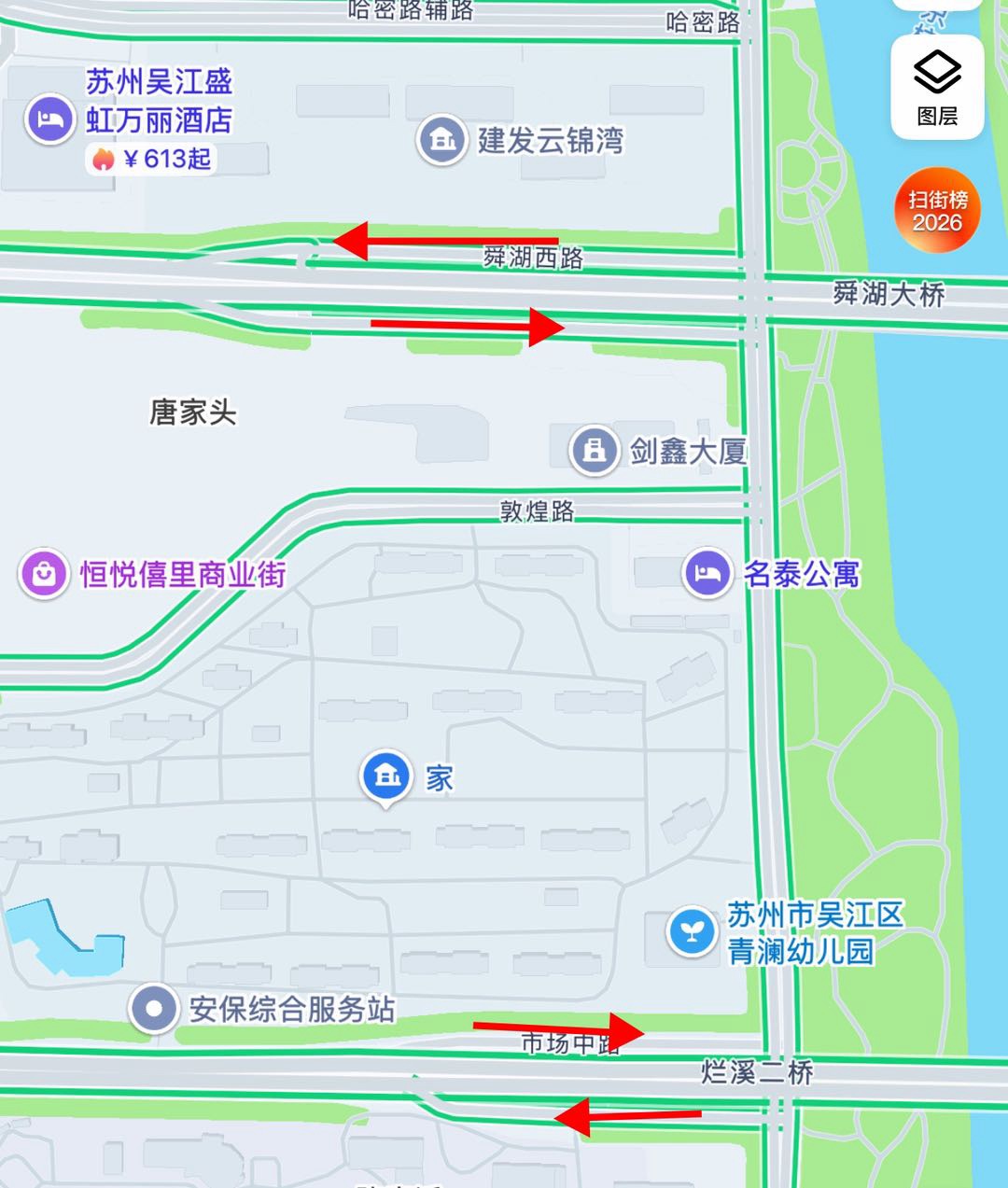 本来舜湖大桥的出行下面都是双侧通行, 挺好 ,小区这里居民出来可以直接上桥,现在猜测因为新酒店 所以把原本可以上桥的两侧都改为不能上桥, 必须从西面绕行到十字路口, 只便于酒店通行,我们接送孩子上下学本来就容易堵车 节约时间,不顾我们居民,只顾酒店,酒店面子大是吧?
