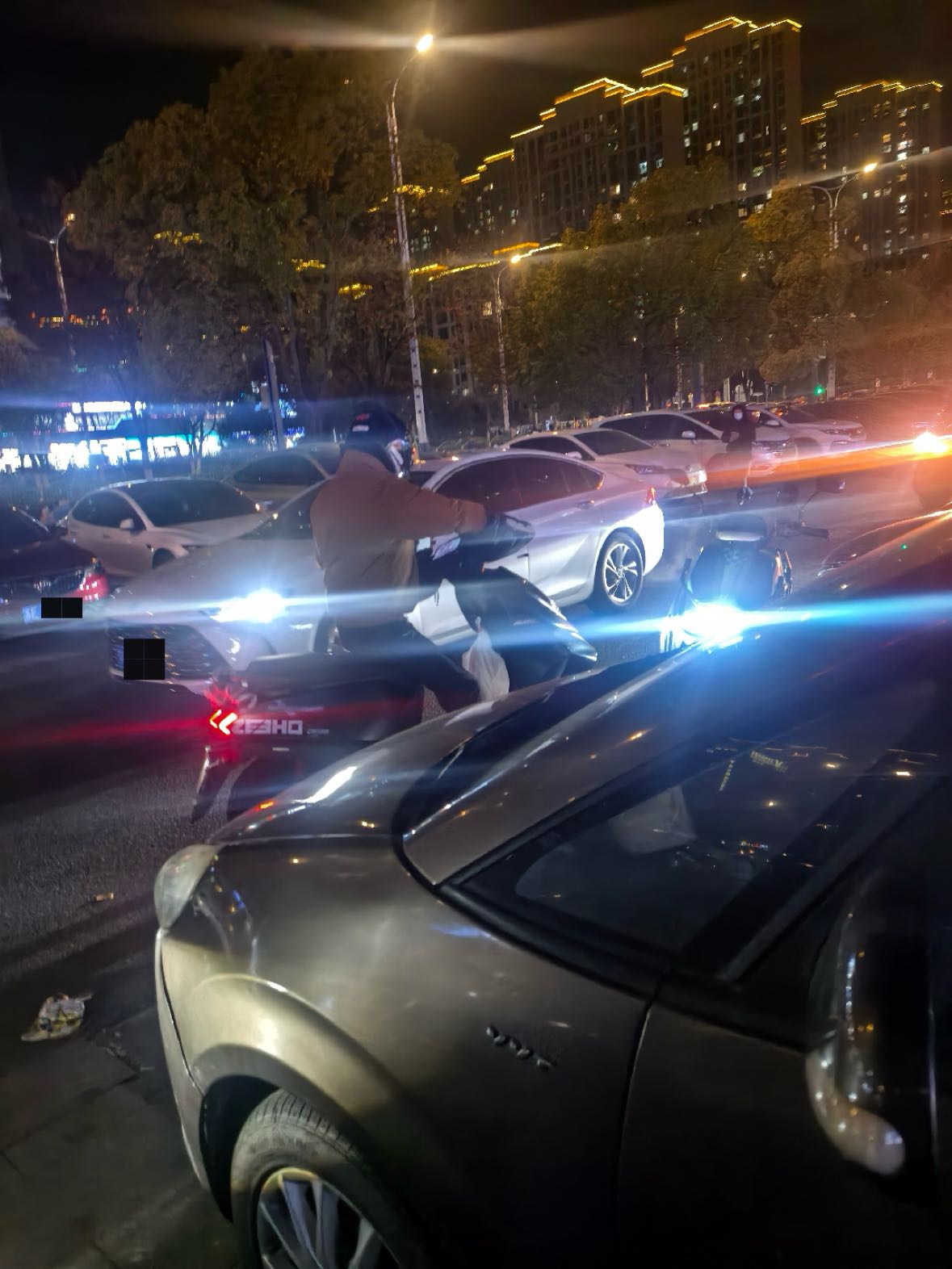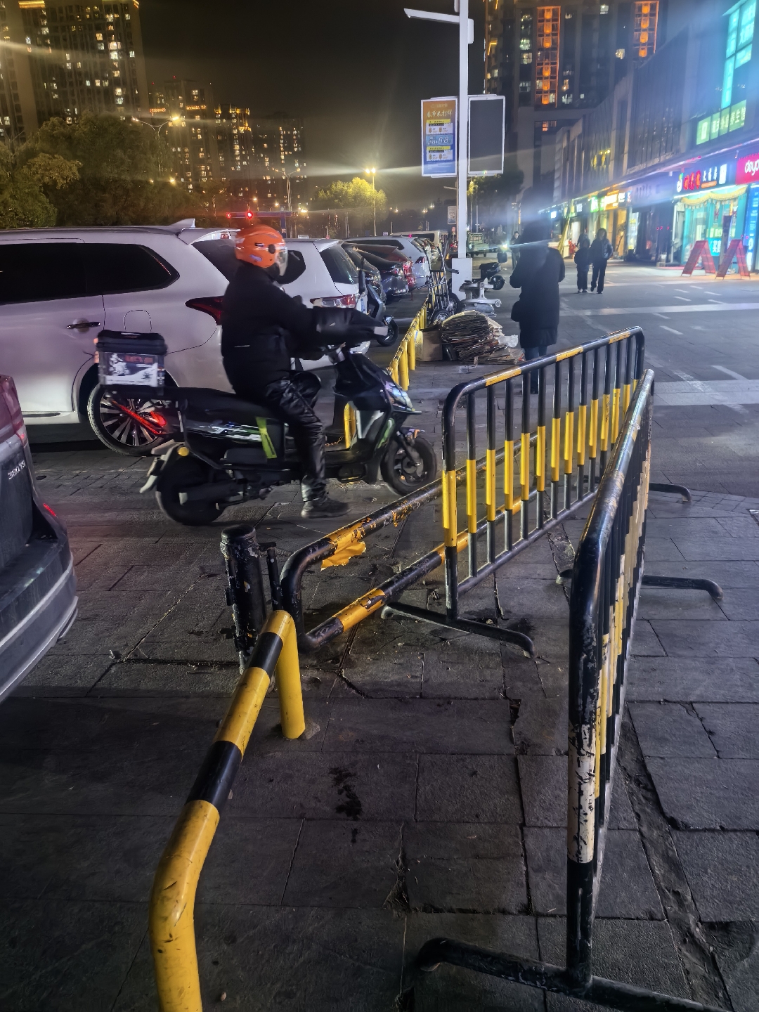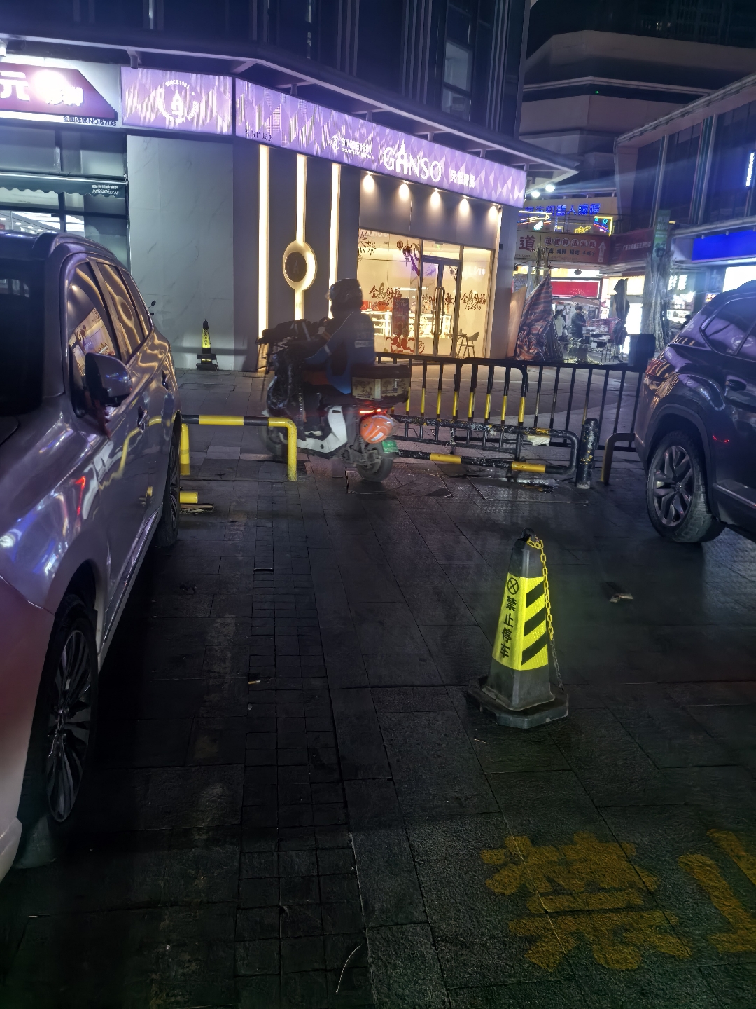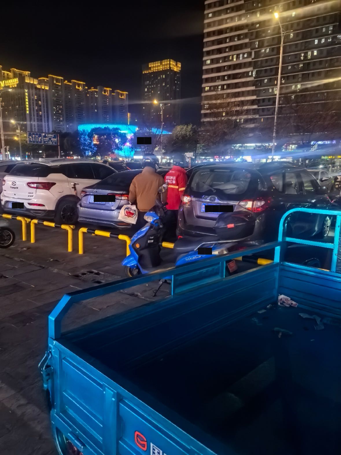 这个停车场里面外卖电动车乱窜,原有的栏杆被打开一个缺口,外卖员骑车开进这个地上停车场,并且把车停在停车场里面,拿完外卖在骑车出去,导致里面很混乱,也很容易刮蹭。