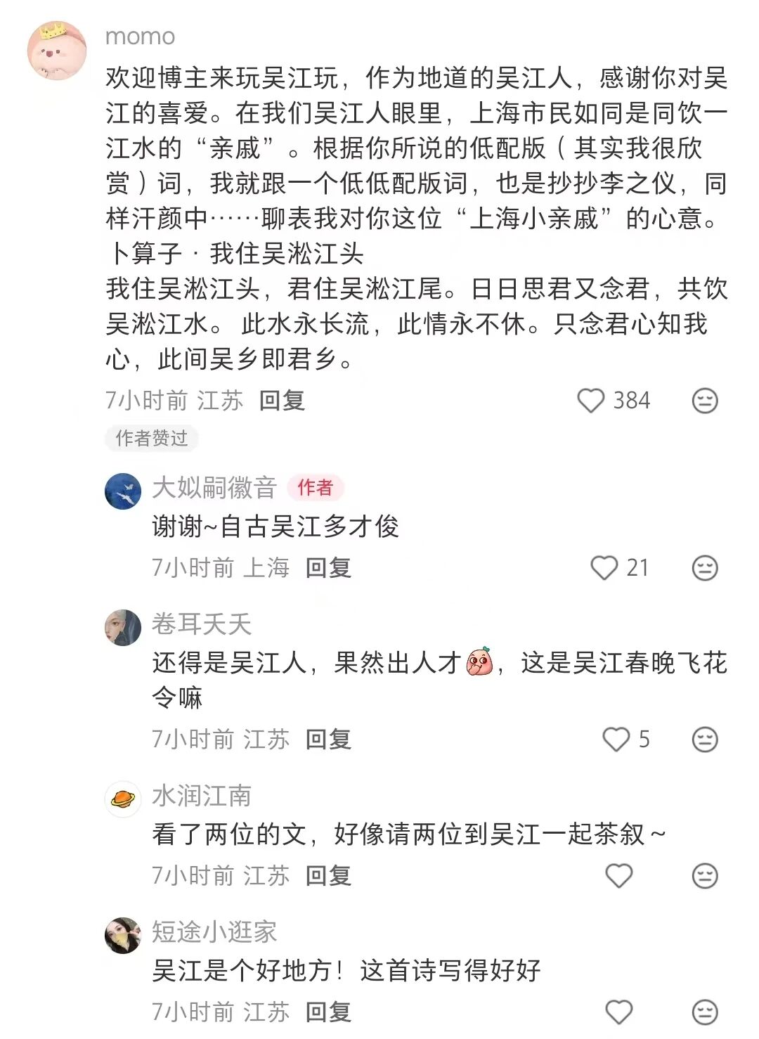 近日,小红书博主@大姒嗣徽音 模仿《卜算子·我住长江头》而来的《卜算子·我住苏州河》引来网友共鸣: