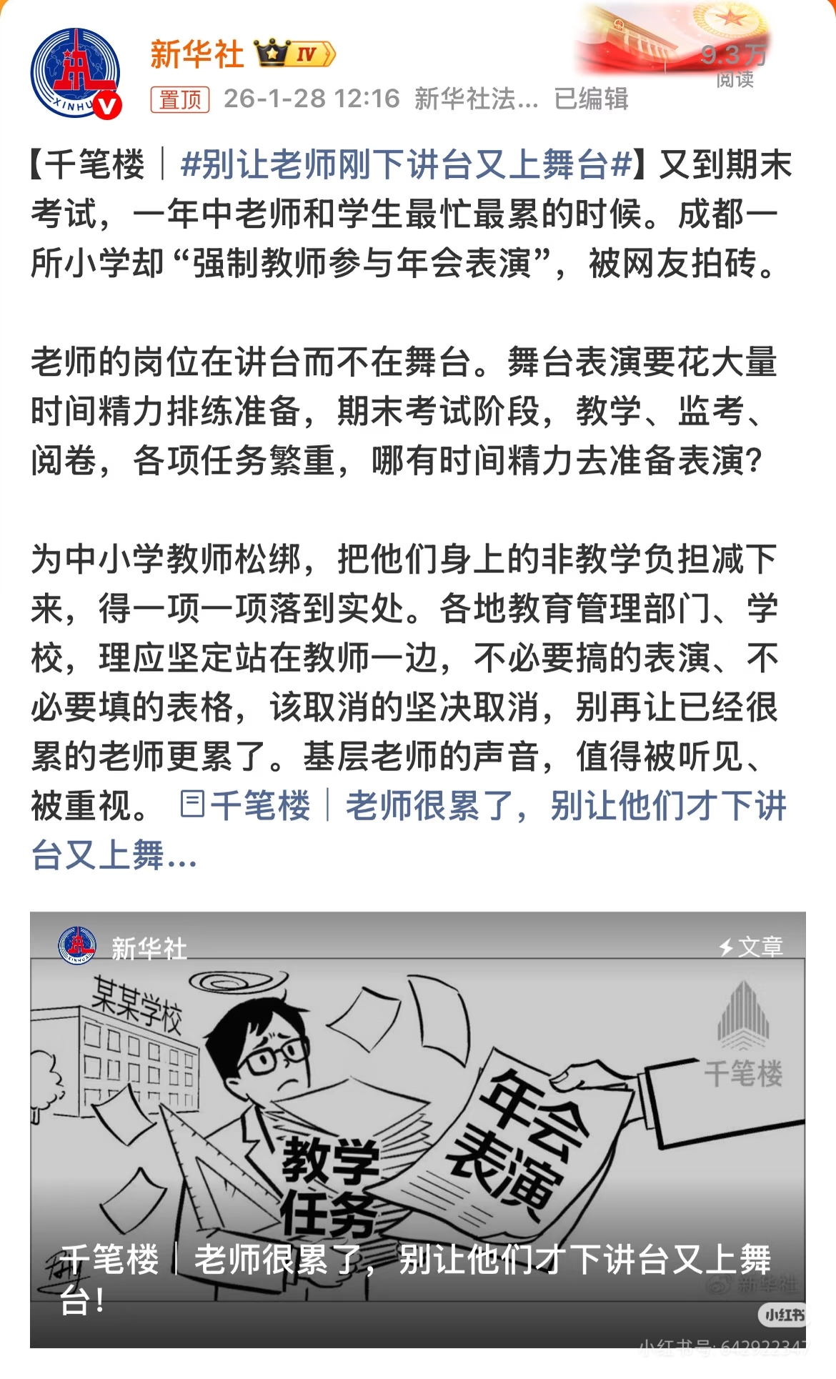 我家娃跟我说学期末了说他们任课老师还要去表演节目,让我很是气愤。按照1月28日新华社锐评的四川某小学违规让教师参加年会的事情,杨嘉墀是不是也要求了教师参与年会表演,特别是期末阶段,学生都在认真复习,老师辅导至关重要,不管是否占用上课时间排练,举办年会势必会让老师分心,学生的成绩不要了吗,是形式主义还是为了取悦校领导,值得考量。