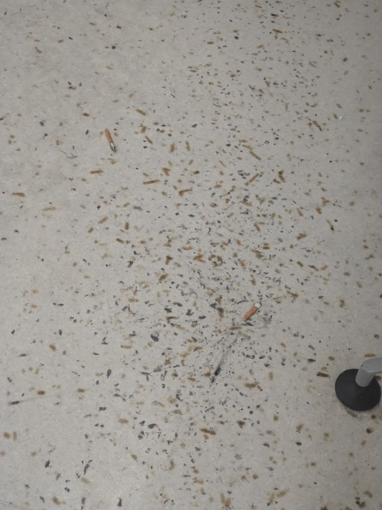 吴江第九人民医院五号楼二楼透析室隔壁休息区,抽烟情况好转。但零散还有。增加了保安值班。等保安走了,仍然有烟头。把垃圾桶也拿走了。虽然休息室明显好转,但也有人去楼梯间抽烟,楼梯间没有禁烟标识。