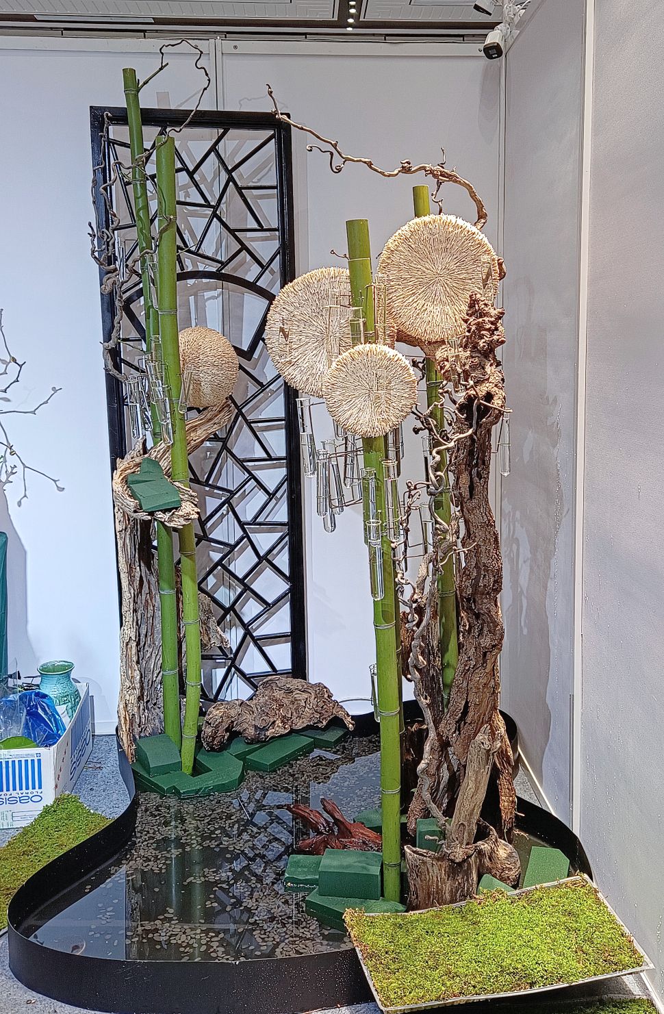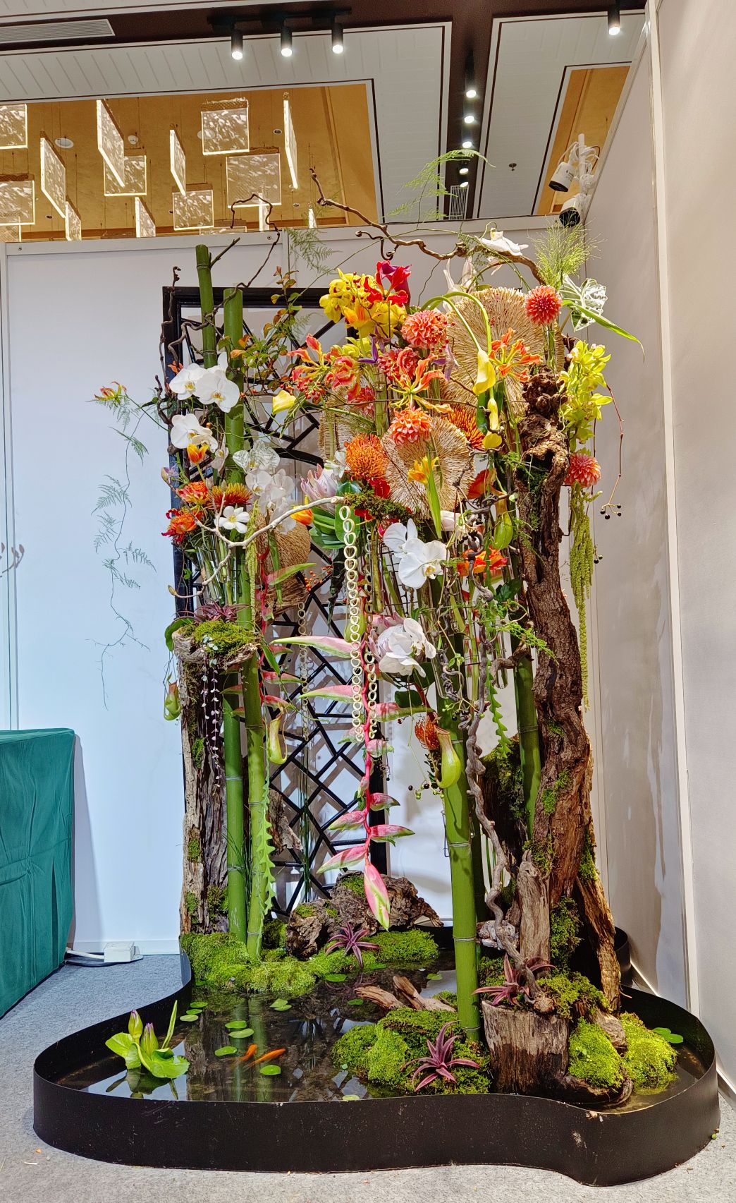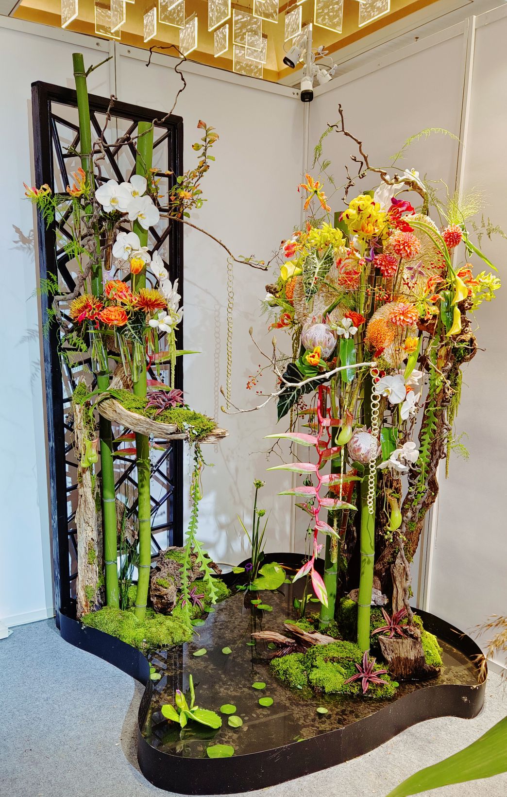 此作以苏州园林窗棂为景,四枚木圆轮与月牙饰为引,构建“窗棂之外”的花境之约。枯木竹骨为架,汇聚帝王花、蕙兰、针垫花等高端花材,衬以苔藓、锦鲤,融奢雅与野趣于一体。
