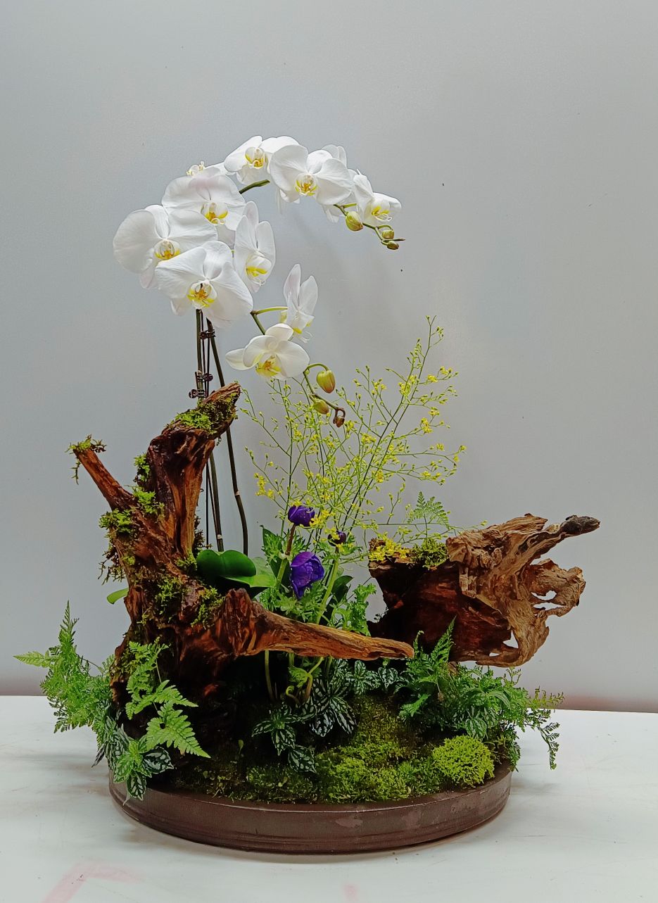 这盆盆景式盆栽,以苍劲老桩为骨架,天然景观石与温润苔藓铺陈意境,搭配素面紫砂盆为器,再缀以清雅蝴蝶兰与灵动文心兰。花姿舒展有致,叶态温润含蓄,兰香幽淡,气韵沉静。咫尺之间藏山林意趣,兰韵与盆景风骨相融,不喧不闹,尽显东方花艺的雅致与格调,静置于室,满室生香,愈品愈有韵味。
