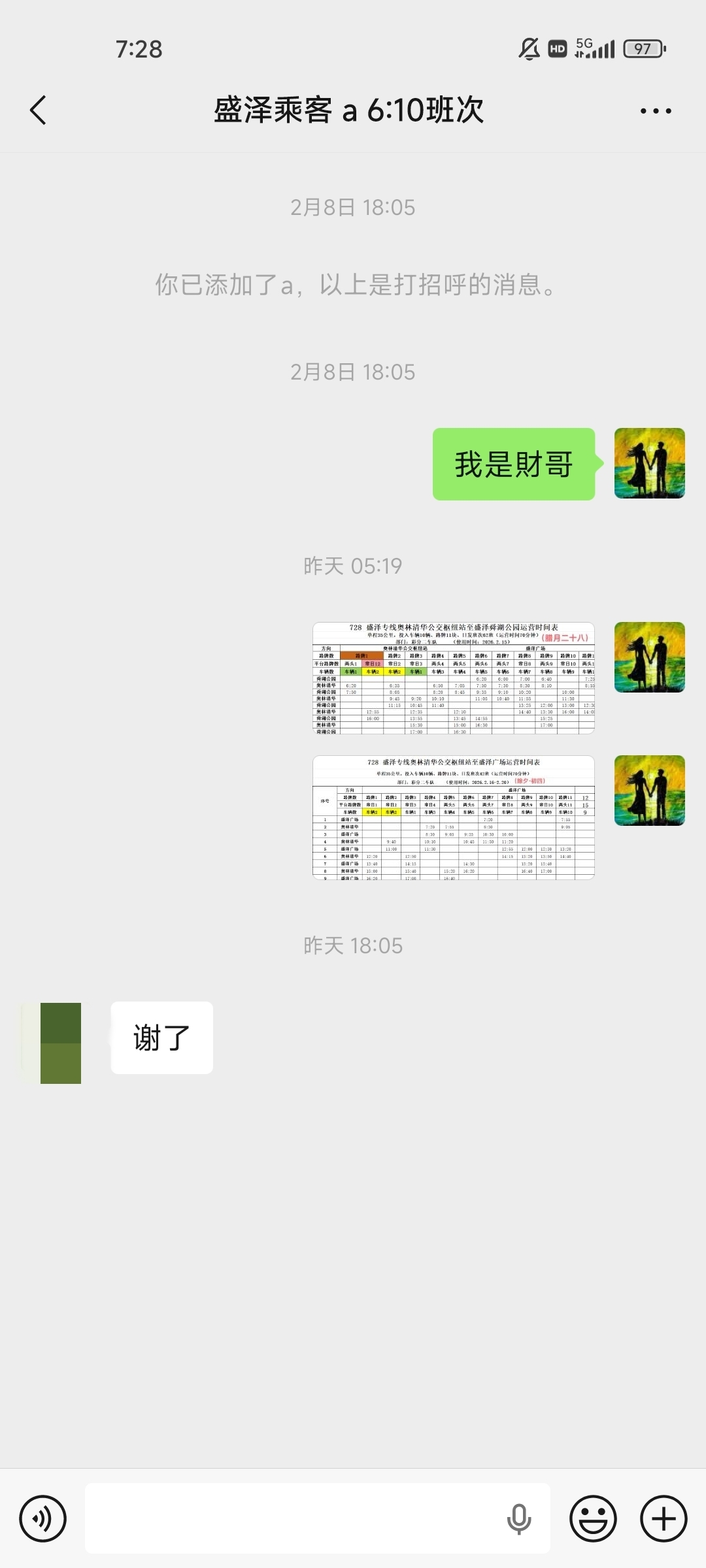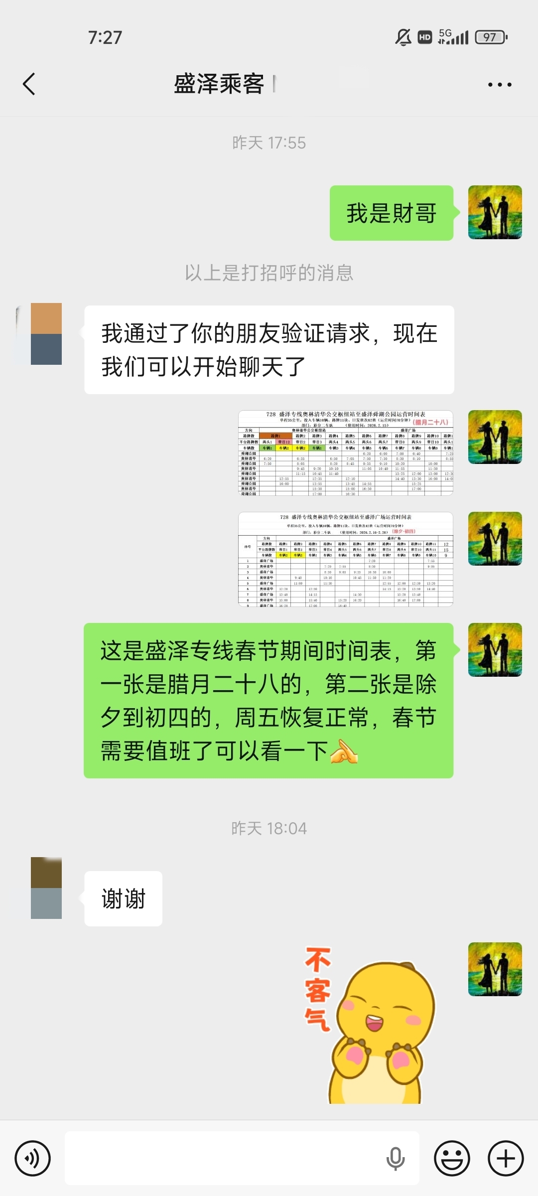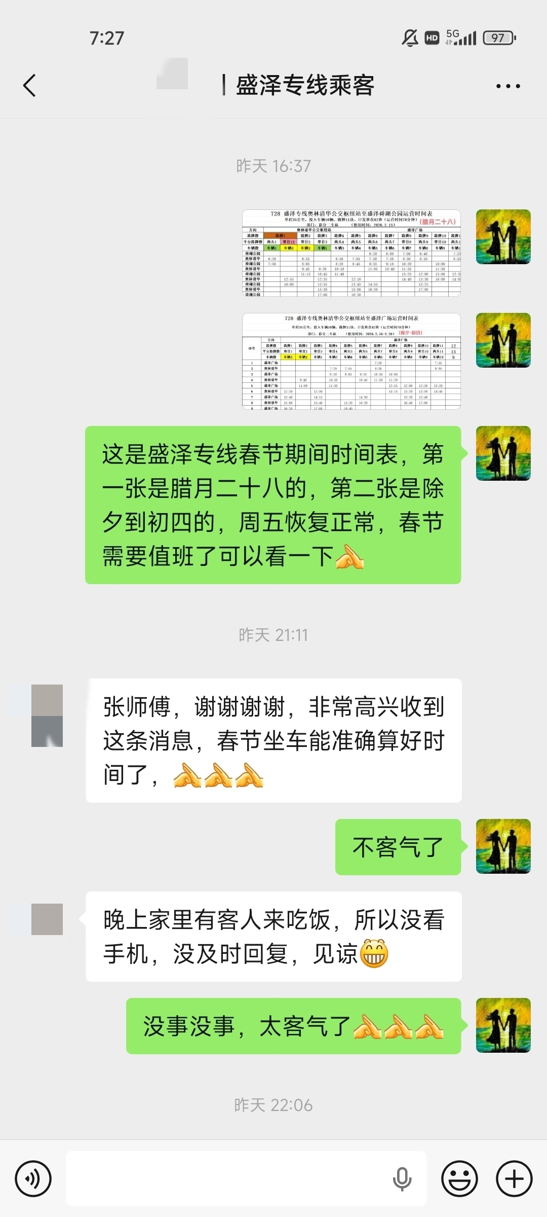 昨天把车队新的春节期间的我们线路的班次时间表发给了这几位乘客,他们都是春节期间有轮到值班的,都提前给我说了;然后我又在这两张班次时间表的后面,分别备注了“腊月二十八”和”除夕至初四”字样,目的就是让看上去清清楚楚,因为这两个时段班次也是不一样的。